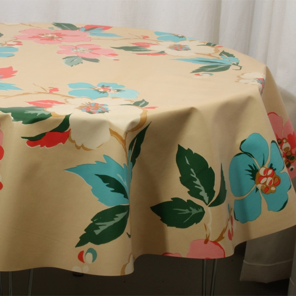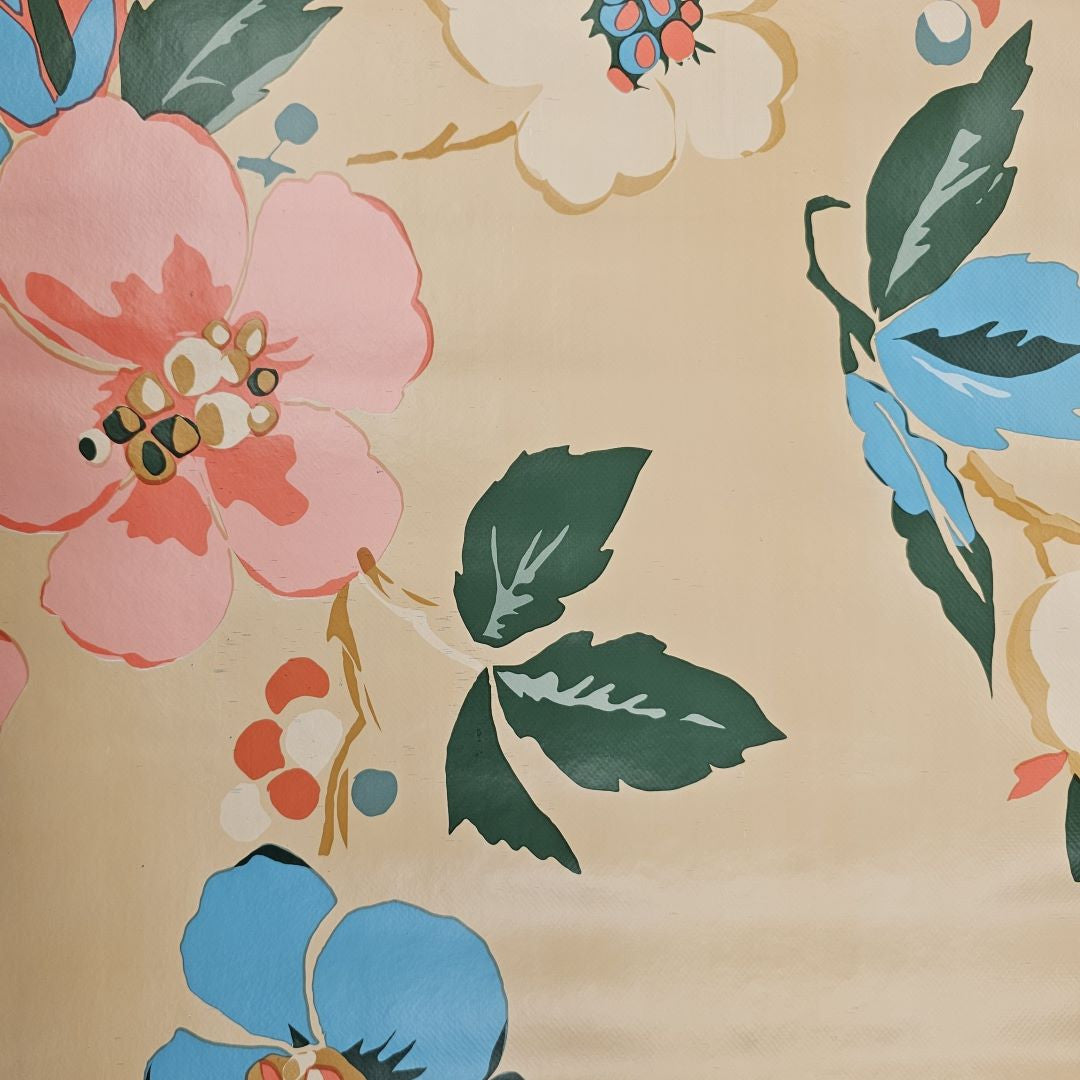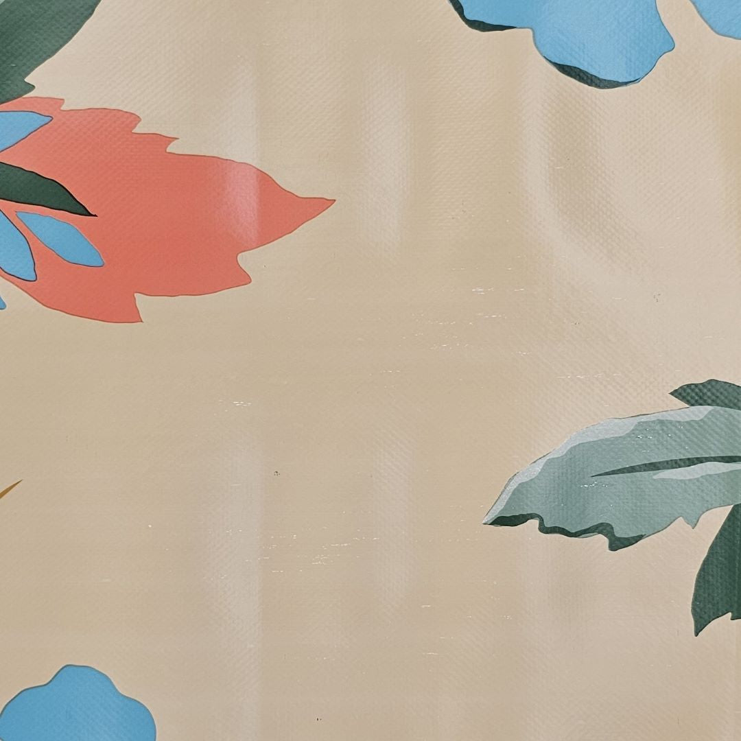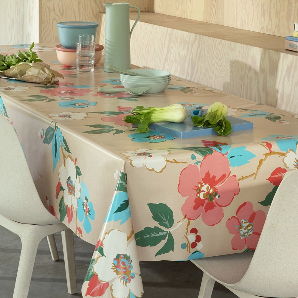 Denne nye voksduken fra Lola utmerker seg med en sjelden fargekombinasjon. Det er vanskelig å sette fingeren på nøyaktig hva det er, men den beige bunnfargen kombinert med lyserosa og lyseblå toner – og kanskje mest av alt de skarpe mørkegrønne rosebladene – skaper en nydelig fargepalett. Et friskt og nytt uttrykk til stuen, hagestuen eller hagebordet.