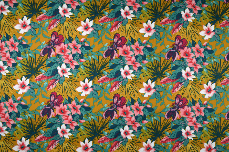 Ahuna - Akrylduk med vakre blomster på sennepsgul bakgrunn - 155 cm bred er i restordre og sendes så snart varen er på lager igjen.