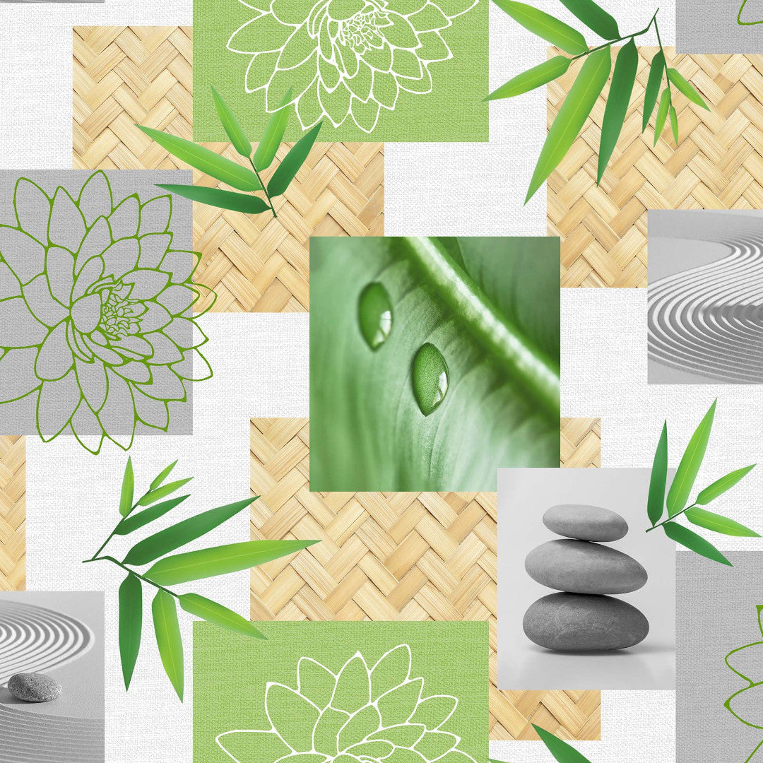 Zenia er en rund voksduk i Ø 155 cm med et friskt og balansert uttrykk inspirert av naturens ro og asiatisk spa-stemning. Det grafiske mønsteret kombinerer grønne blader, zen-steiner, bambus og stiliserte blomster i dempede nyanser av grått, grønt og sand. En voksduk som både skaper blikkfang og ro rundt bordet – perfekt for deg som ønsker en praktisk duk med harmonisk design.