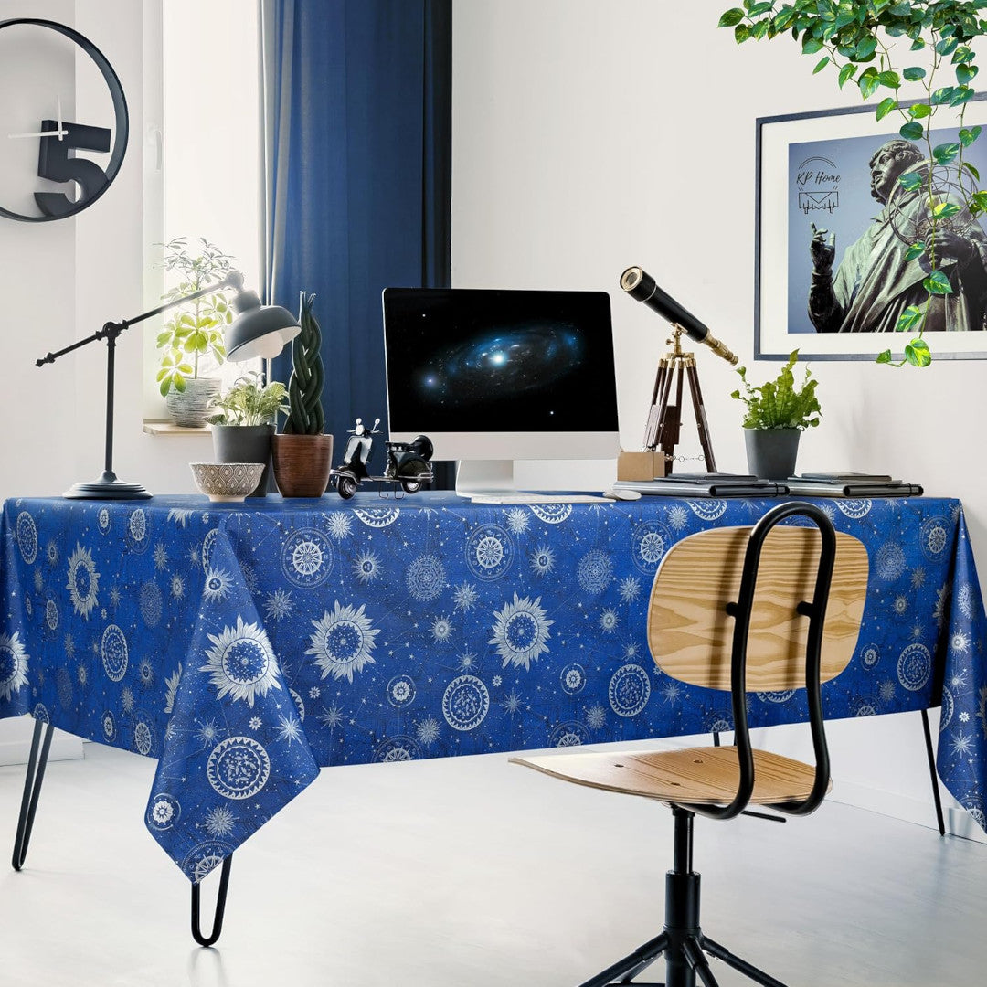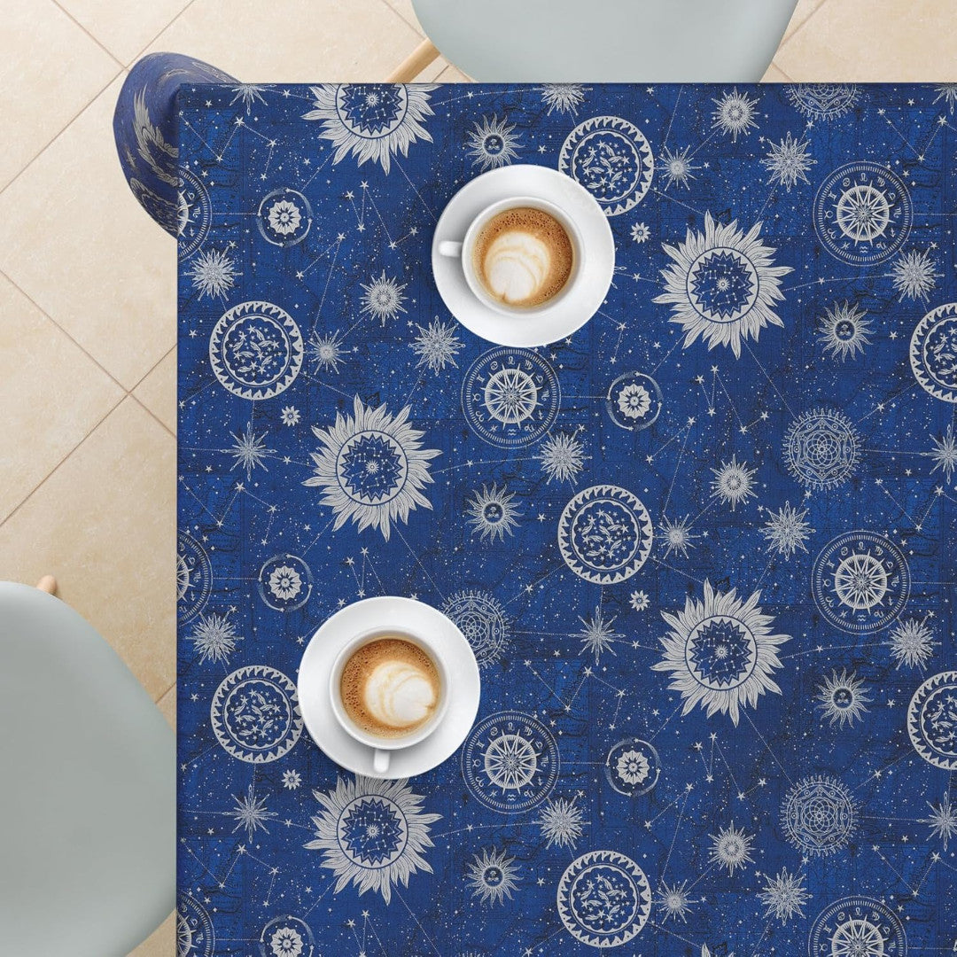 Astra Blå er en stemningsfull voksduk med en dyp nattblå bakgrunn, lett melert som en mørk himmel. Sølvfargede stjerner, stjernetegn og små kosmiske rosetter sprer seg over overflaten i et harmonisk mønster, der fine prikker og linjer gir følelsen av en ekte stjernehimmel. Større sol- og stjernerosetter veksler med mindre kompasslignende motiver og skaper et vakkert, rytmisk spill over bordet.