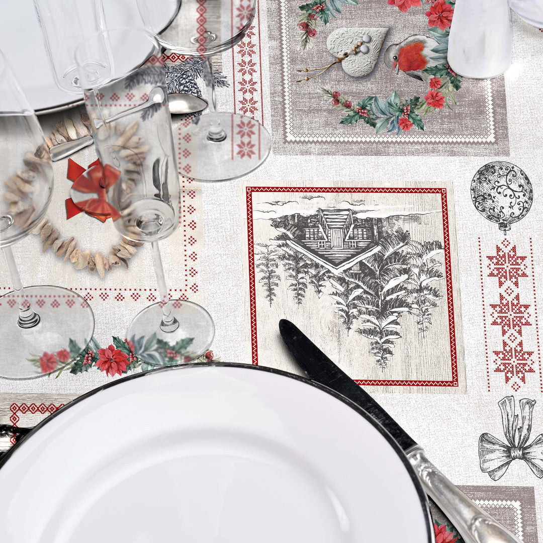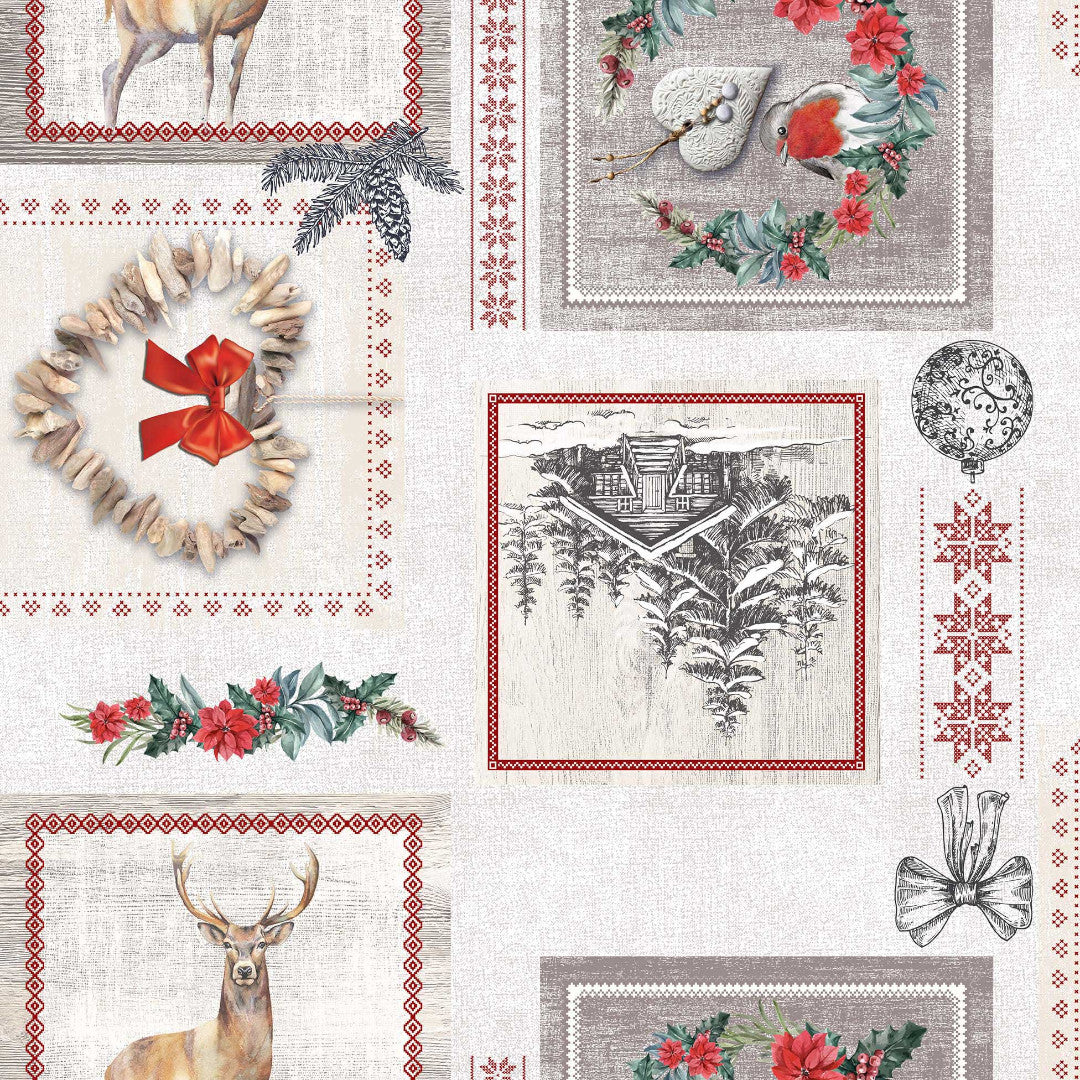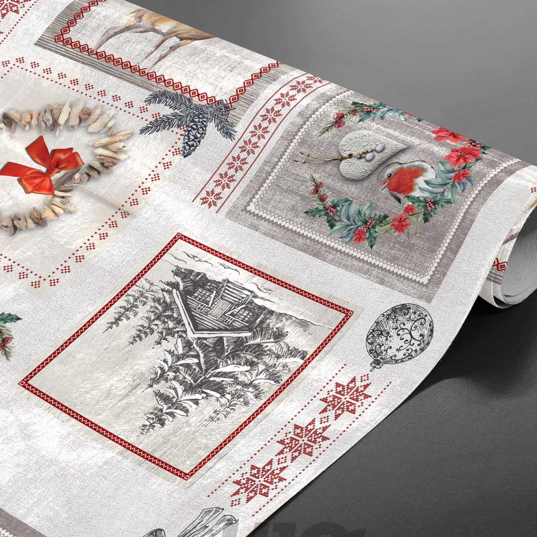 Skap en koselig og varm fjellstemning i hjemmet med denne sjarmerende julevoksduken. Den passer perfekt både til hytta og hjemme, der du ønsker å ta med deg naturens skjønnhet og julehyggen innendørs. Med vakre motiver av snøfnugg, grantrær, rustikke tømmerhytter og majestetiske hjorter – kombinert med festlige kranser og elegante juleelementer – fanger denne voksduken essensen av vinterens ro og julens glede.
