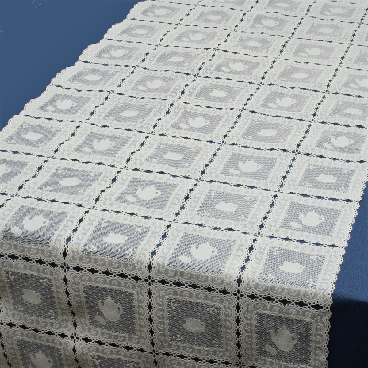 Hvit blondeduk med et sjarmerende tekanne-motiv. Perfekt som bordløper til kaffebordet eller koselige sammenkomster.