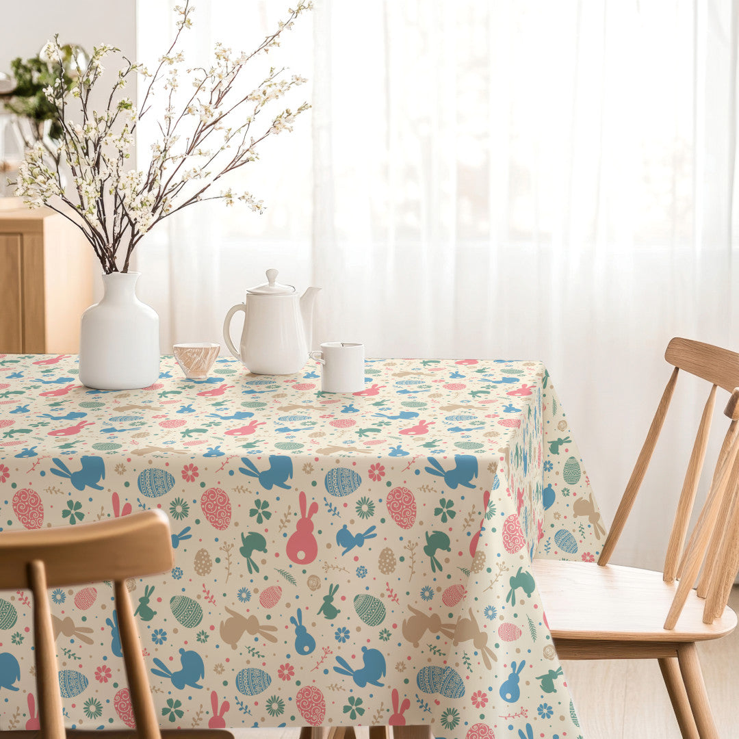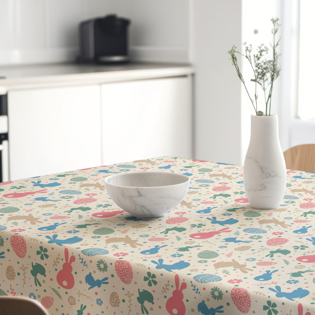 Bunnys & Eggs er en akrylduk med et lekent og fargerikt mønster av påskeharer, dekorerte egg og små blomster i myke pastellnyanser. Motivet gir bordet en lett og hyggelig påskestemning som passer perfekt til vårens sammenkomster og påskelunsjer.