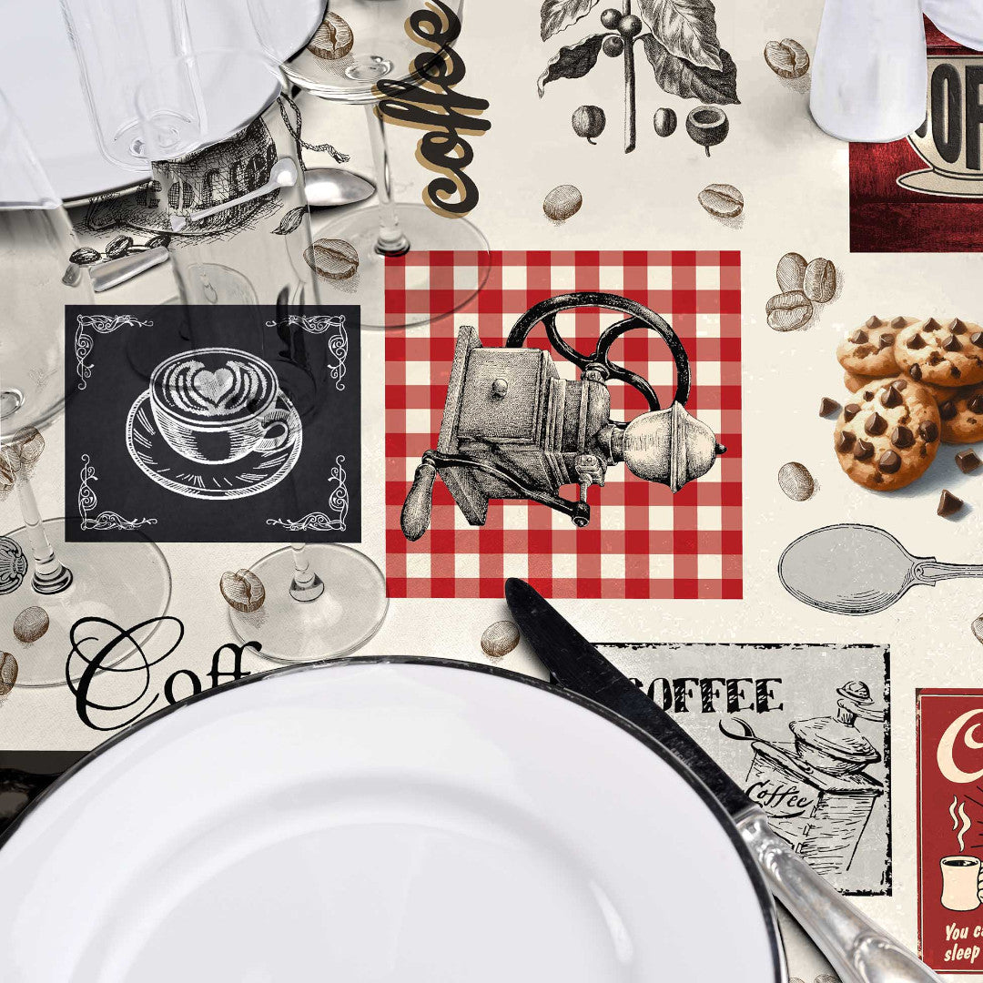 Er du glad i kaffe, vintage og lun stemning? Da er Café voksduken et opplagt valg – både for hjemmet og profesjonelle miljøer som kafeer, kaffebarer og frokostrestauranter. Designet byr på nostalgiske detaljer: retro kaffereklamer, gamle kaffekverner, dampende kopper, kaffebønner og småkaker – alt i varme nyanser av beige, svart, rødt og brunt.