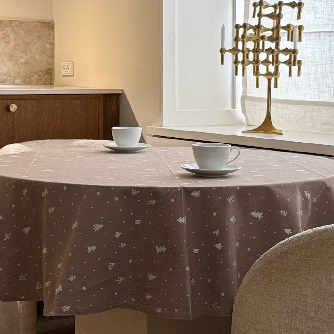 Christmas Carol Natur er en rund damaskvevd juleduk i en varm beige tone med små, fine figurer av grantrær, stjerner og gaver. Mønsteret er vevd som diskrete detaljer som trer tydelig frem, men likevel gir et rolig og balansert uttrykk.