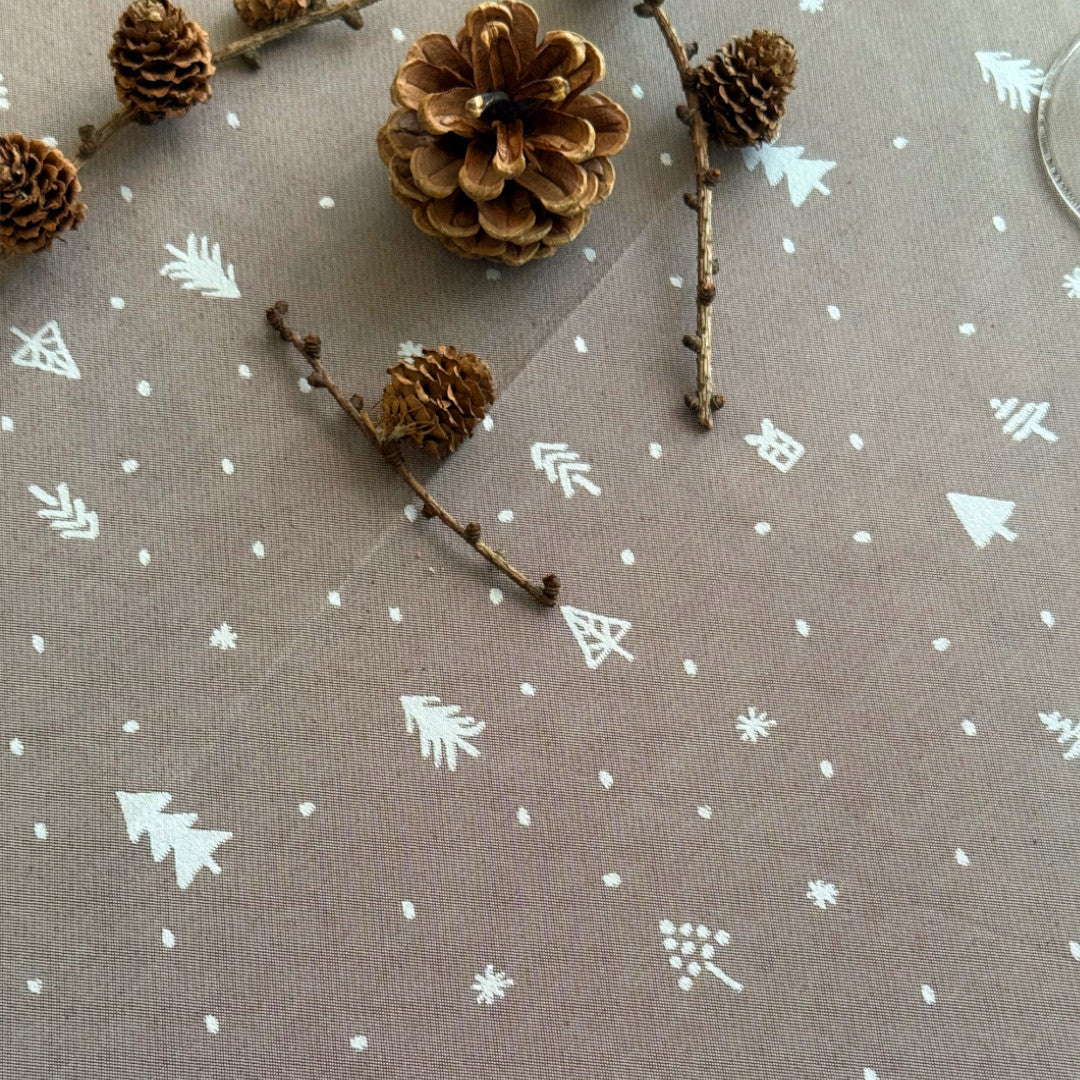 Christmas Carol Natur er en rund damaskvevd juleduk i en varm beige tone med små, fine figurer av grantrær, stjerner og gaver. Mønsteret er vevd som diskrete detaljer som gir et lett og balansert uttrykk på den store duken.