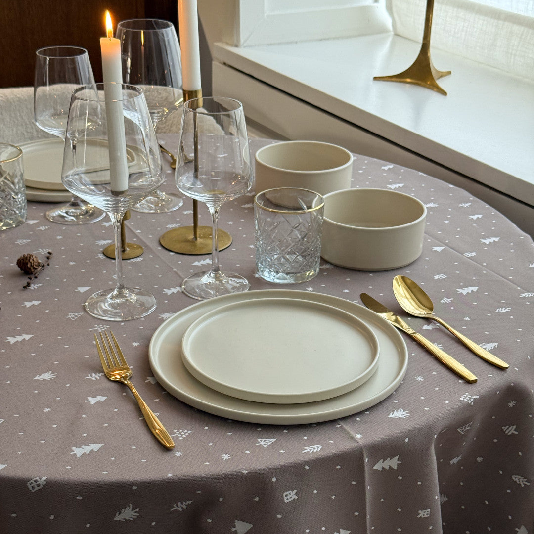 Fargene i natur og hvitt skaper en rolig helhet som passer vakkert inn i nordisk interiør. Den runde formen understreker det myke og enkle uttrykket, og gjør duken velegnet til det store spisebordet der mange samles i desember.