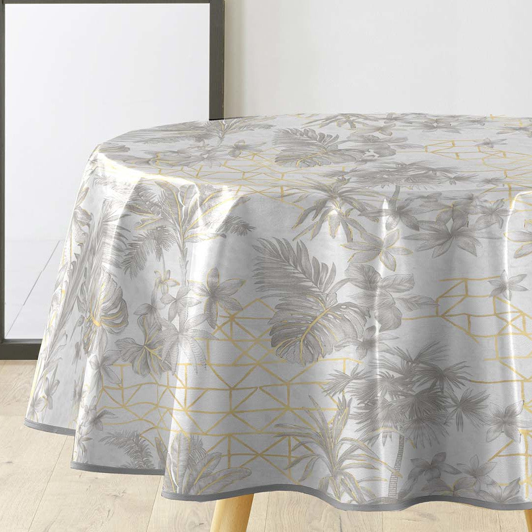 Coconut Metallic – Rund voksduk i grått med gulldetaljer Ø 155 cm