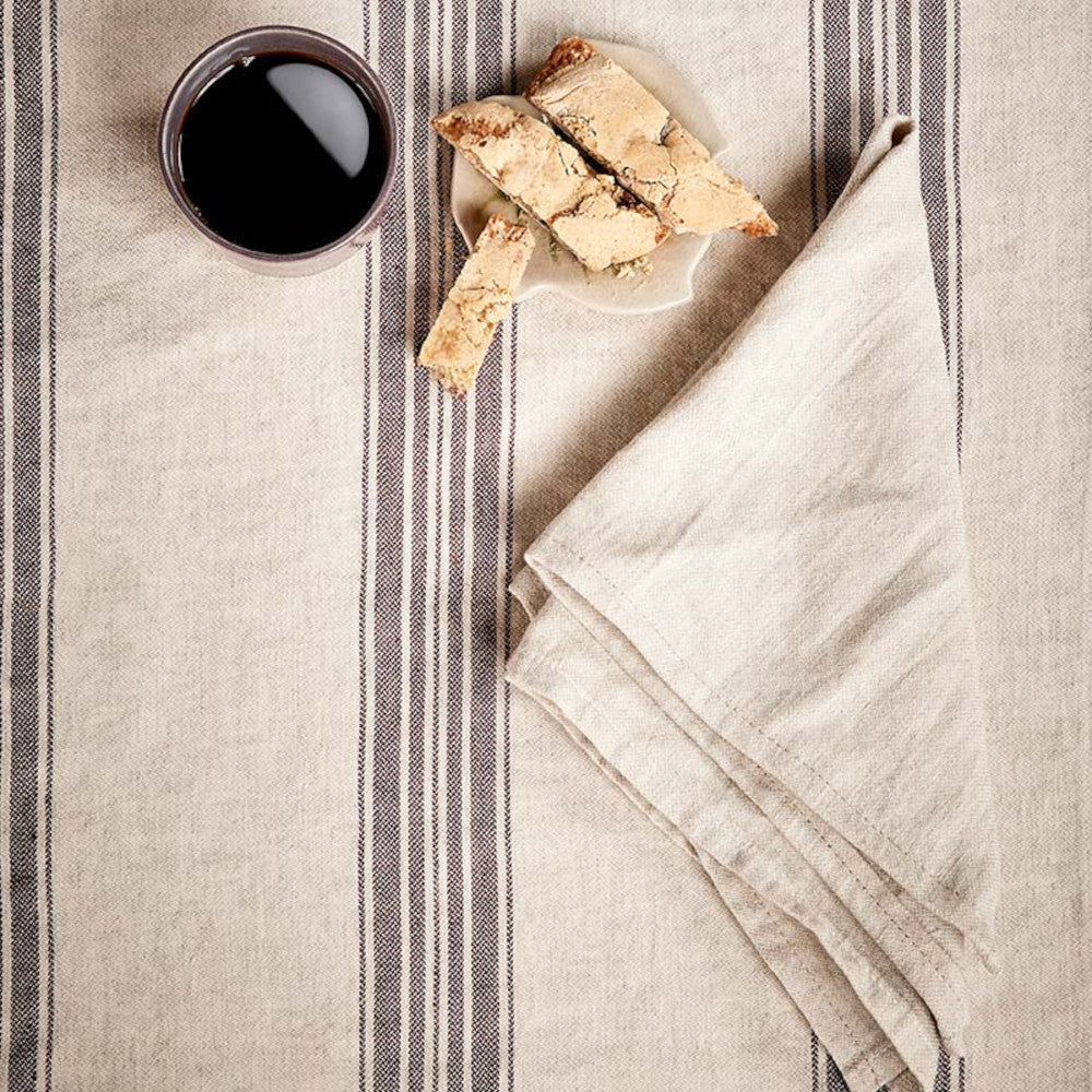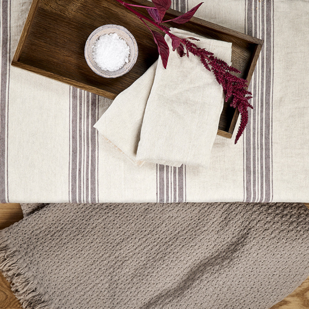 ARLES fremstår som en subtil form for luksus, skapt gjennom den utsøkte kombinasjonen av lin og bomull. Den rustikke teksturen fra linet og de diskrete stripene spiller sammen og gir duken et klassisk og avslappet uttrykk.