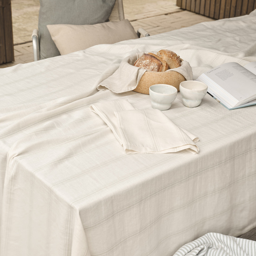 En lett og luftig duk i en vakker kombinasjon av lin og bomull. De grønne stripene på den lyse ecru-bunnen gir et friskt og klassisk uttrykk som passer perfekt til vår og sommer – enten det er til hverdag eller fest.