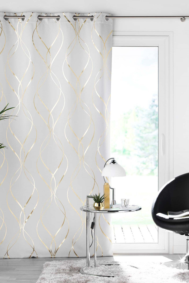 Elise Hvit er et moderne mørkleggingsgardin med et elegant bølgemønster i gyldne metalliske linjer. Den lyse bakgrunnen fremhever de fine detaljene og gir et luksuriøst og luftig uttrykk som passer perfekt til stilrene og klassiske interiører.
