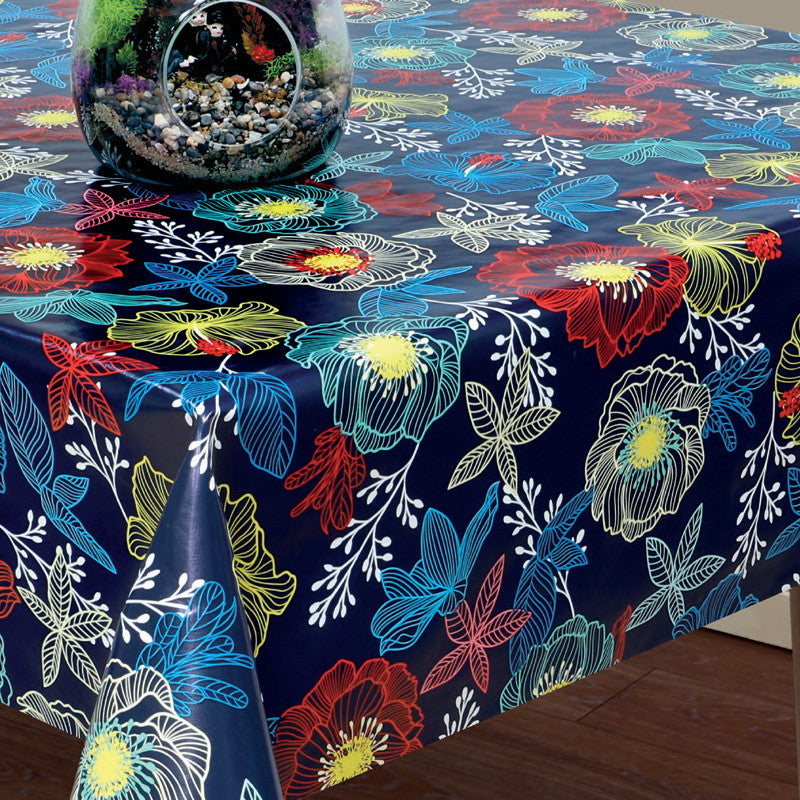Filligranhagen Blå, voksduk med blader og blomster på blå bunn