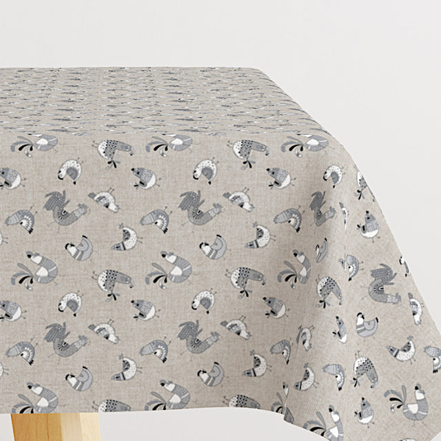 Et lekent mønster med grafiske høns i gråtoner gir denne akrylduken en sjarmerende og rustikk atmosfære. Den nøytrale fargeskalaen gjør duken enkel å kombinere med både naturlige og fargerike omgivelser – og tilfører et snev av personlighet til borddekningen.