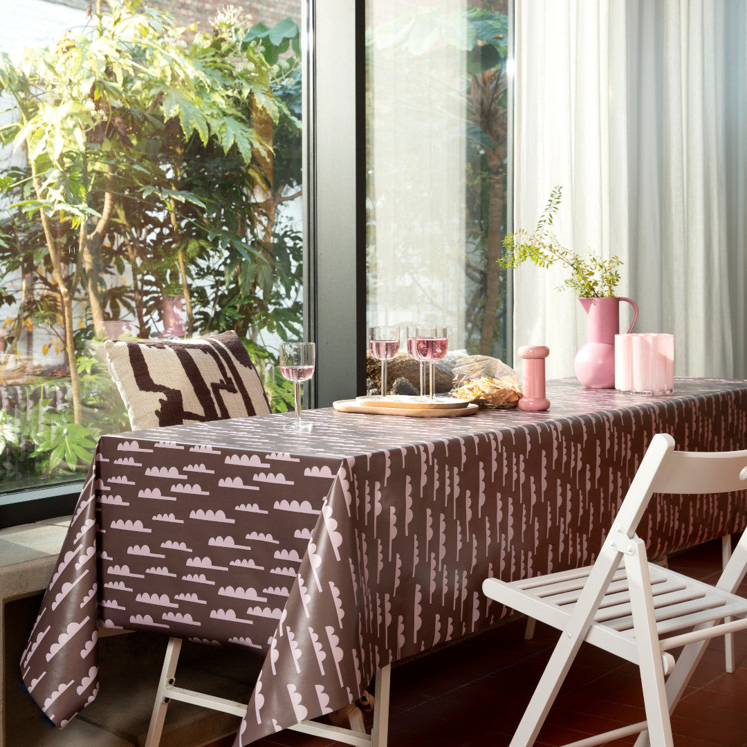 Lola Forest Jump Eggplant voksduk bringer en moderne og kunstnerisk stemning til borddekkingen. Med sin dype auberginefargede bakgrunn og rosa, stiliserte trær, skaper den et grafisk og samtidig mykt uttrykk. Det abstrakte tremotivet tilfører et hint av natur på en leken og sofistikert måte.