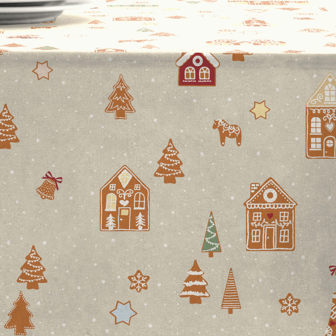 Södahl Gingerbread juleduk er en vakker og stemningsfull akrylduk i 100 % bomull med smussavvisende akrylbelegg. Duken er dekorert med fine julemotiver som pepperkakehus, juletrær, stjerner, reinsdyr og små tog – alt i varme, dempede nyanser som oser av nordisk jul og nostalgisk hygge.