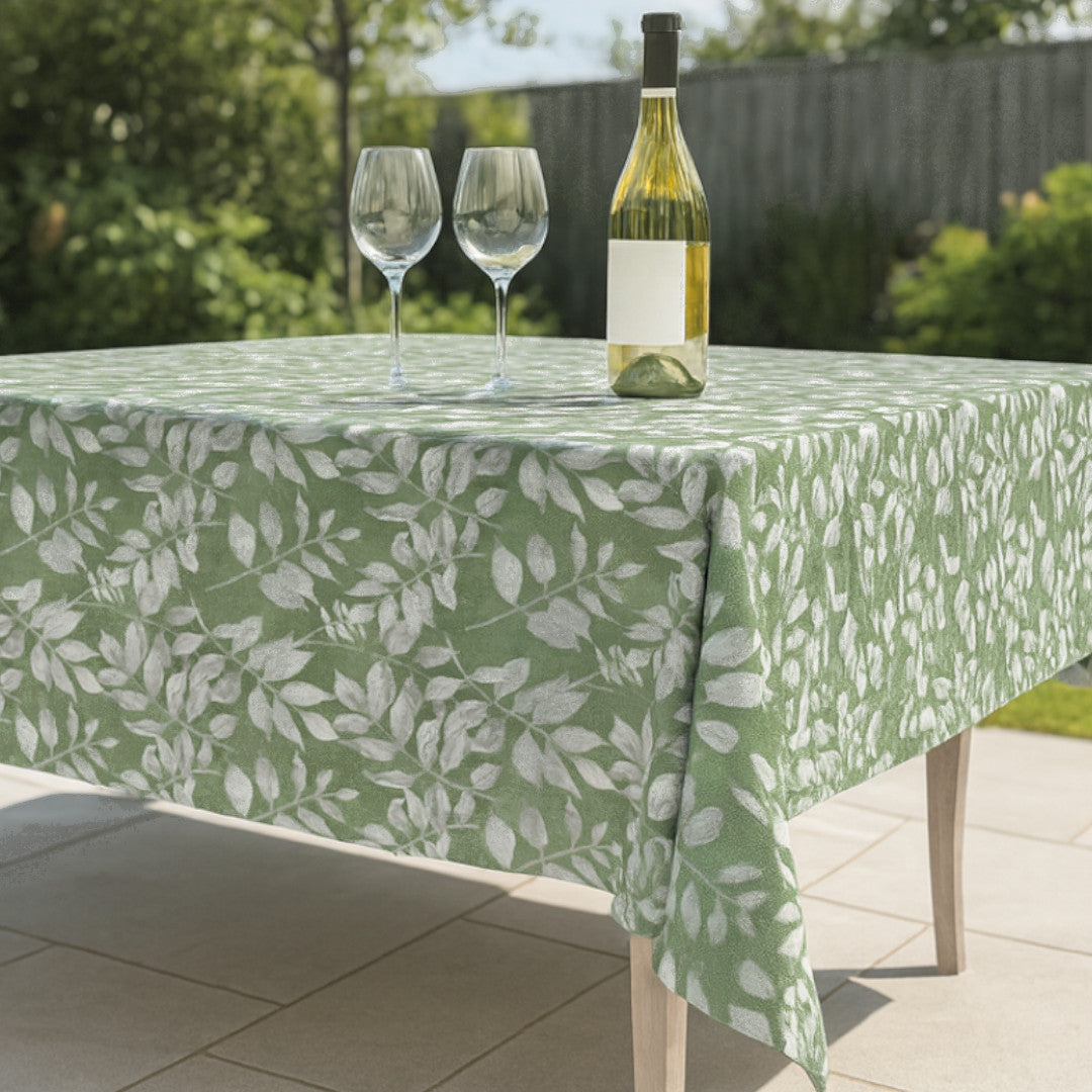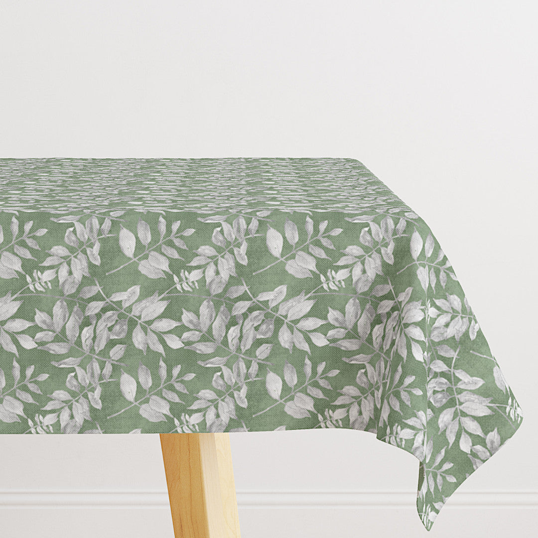 Giordano – Salvieblad er en akrylduk med et mykt, naturinspirert mønster av lysegrå blader på en dempet grønn bakgrunn. Fargen har et hint av salvie som skaper en rolig og harmonisk stemning rundt bordet.