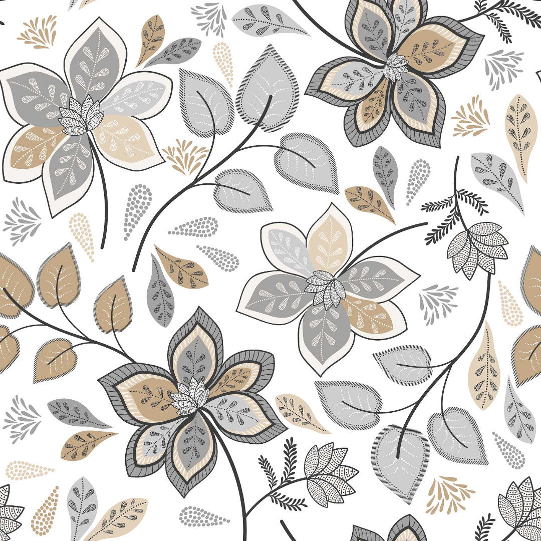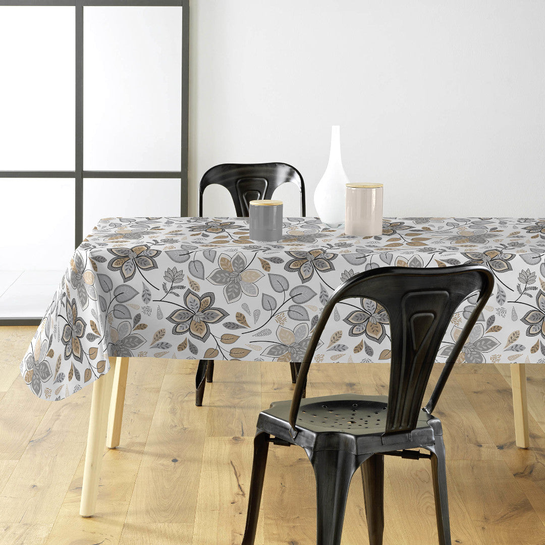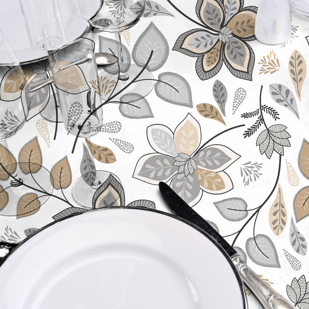 Gloriette er en vakker voksduk med dekorative blomster og blader i dempede grå- og sandtoner. Mønsteret har et lett håndtegnet preg som gir et naturlig og harmonisk uttrykk.