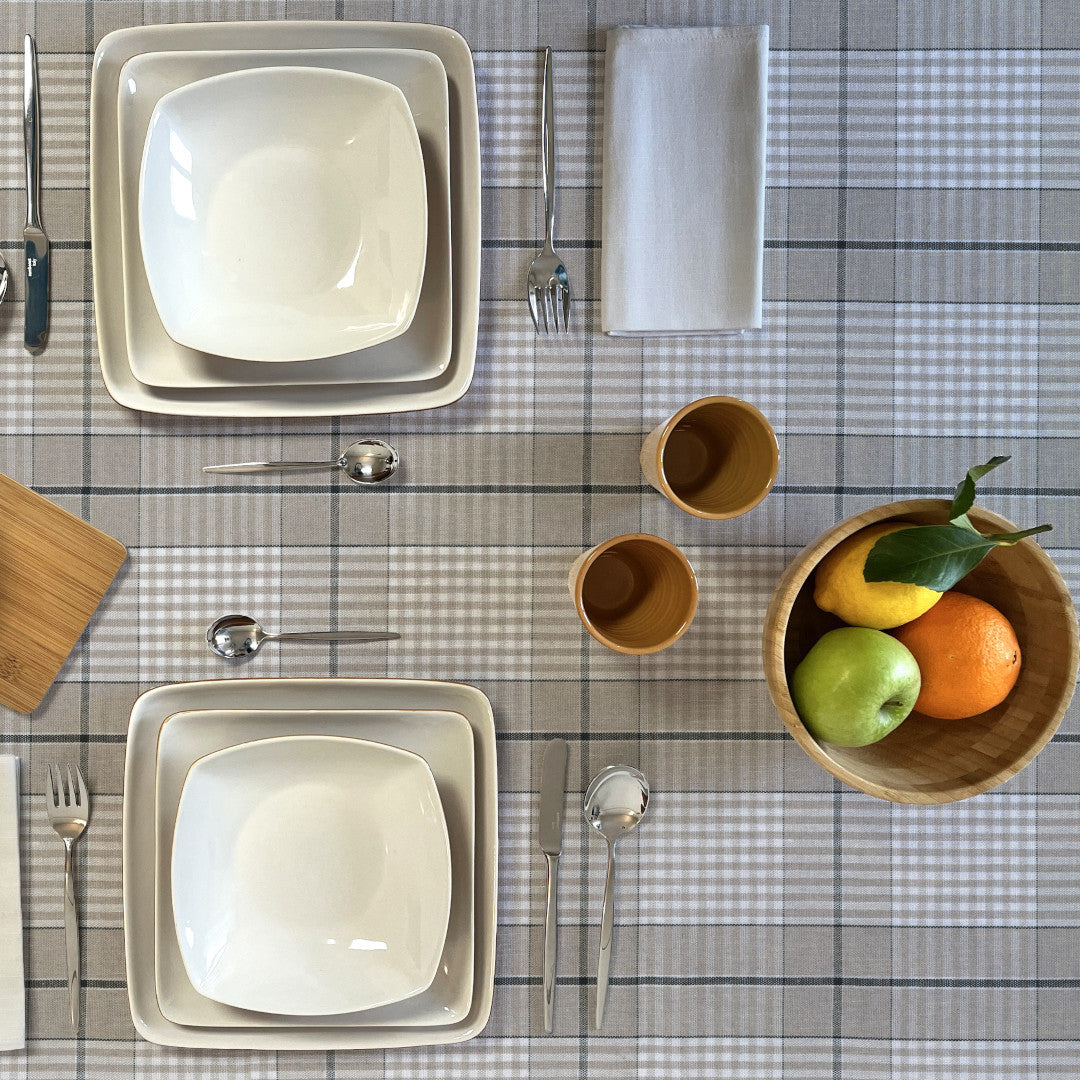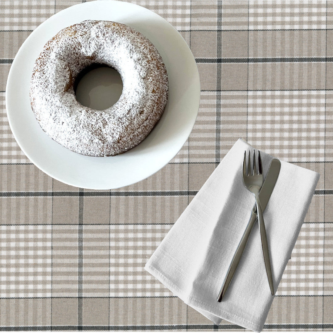Den klassiske olmerruten i en elegant grå nyanse gir en stilren og tidløs borddekking. Olmerruten stammer fra 1700-tallets Danmark, hvor mønsteret ble vevd i ull og lin og brukt til sengetøy og tepper i bondesamfunn. De brede og smale rutene skaper et raffinert mønsterspill som forener historie med moderne estetikk.