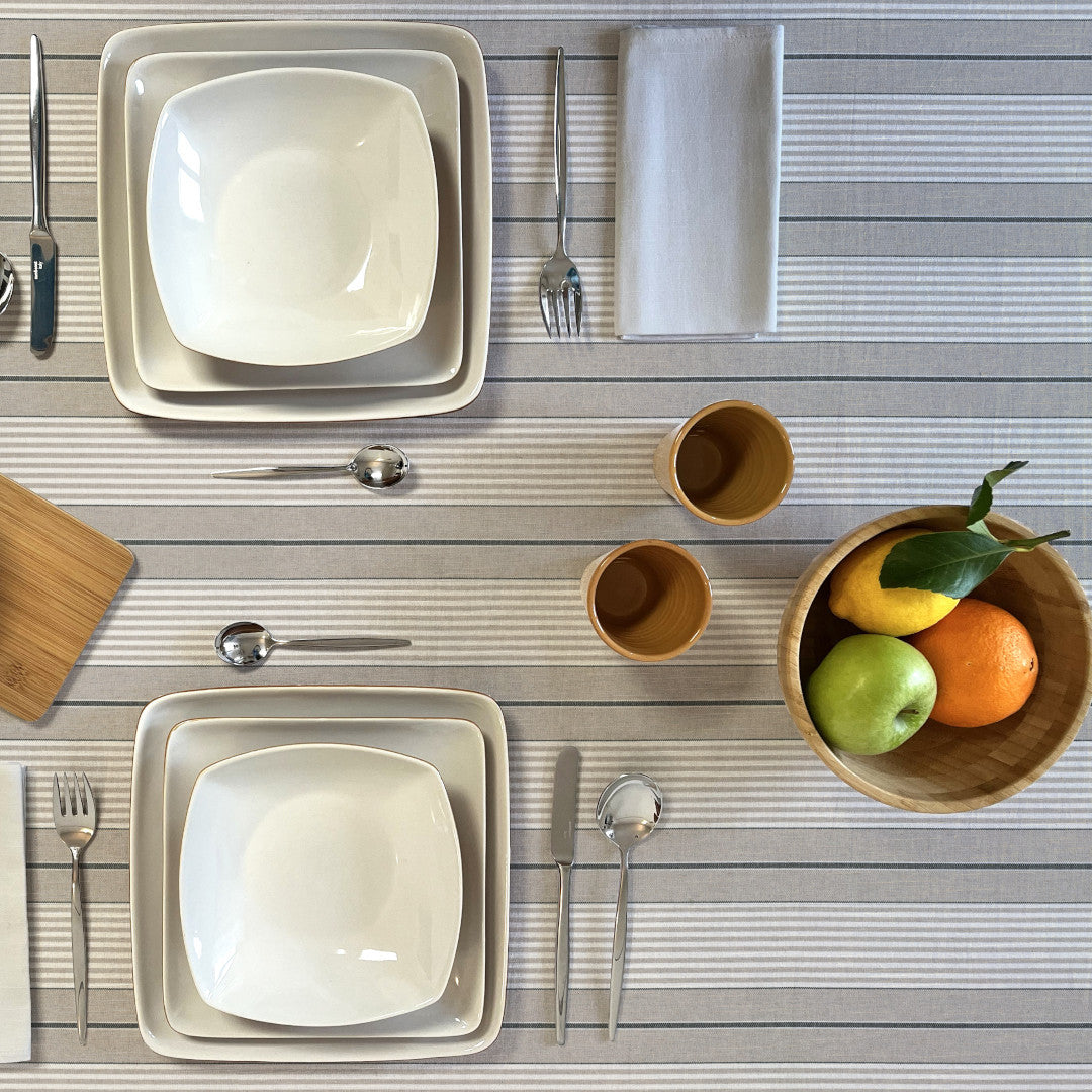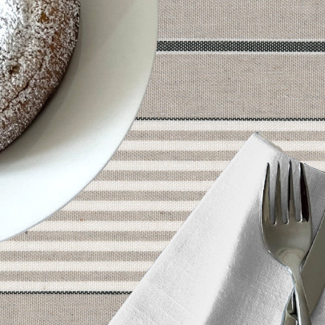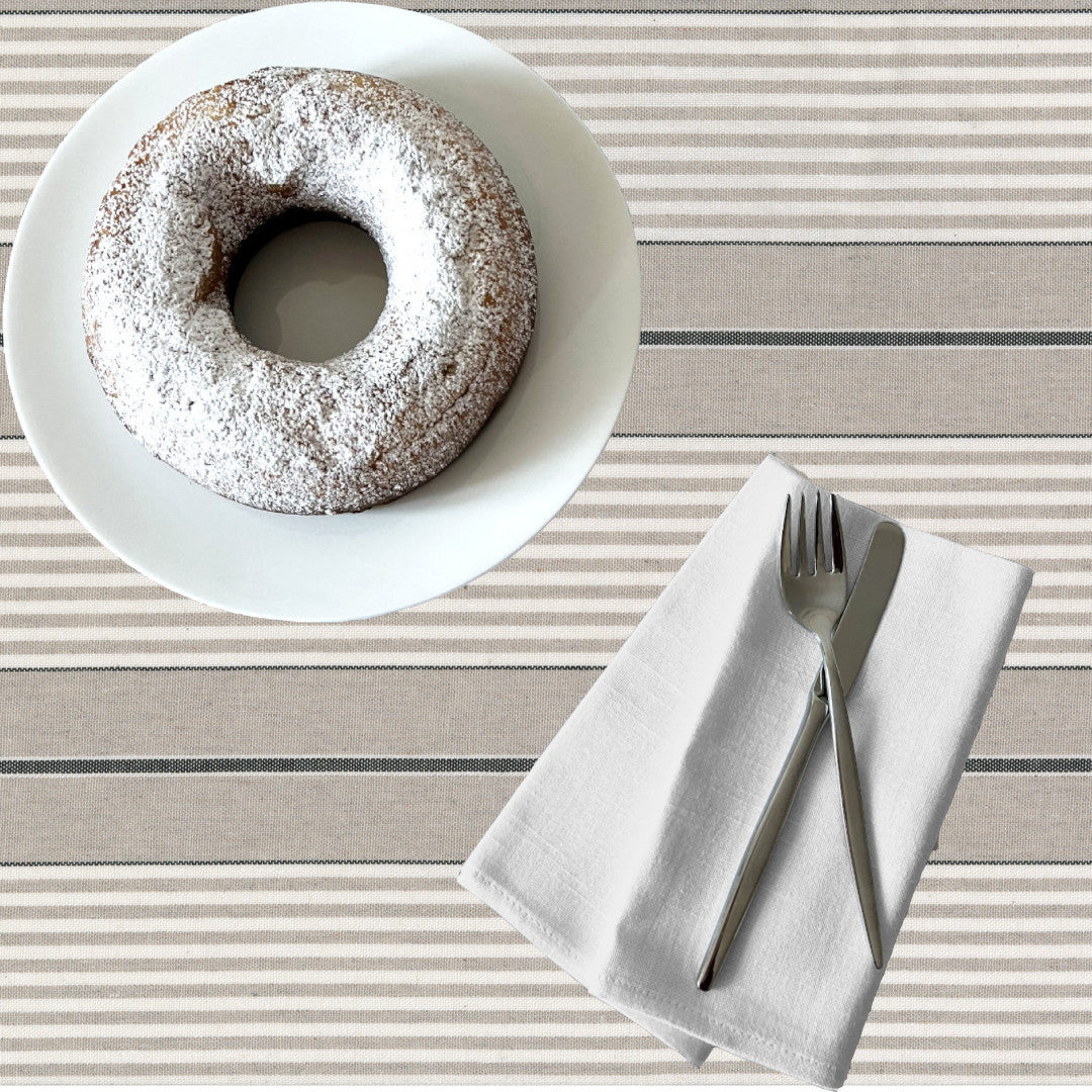 Stripene går langs duken og skaper en harmonisk visuell effekt. Linlookets tekstur gir et naturlig og autentisk inntrykk, mens akryloverflaten gjør duken vannavvisende, slitesterk og enkel å rengjøre. En funksjonell og dekorativ løsning – både til hverdags og fest.