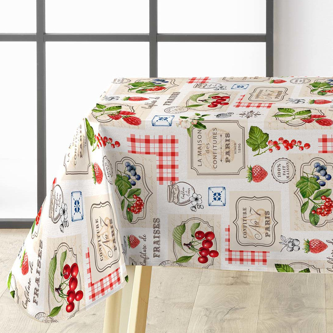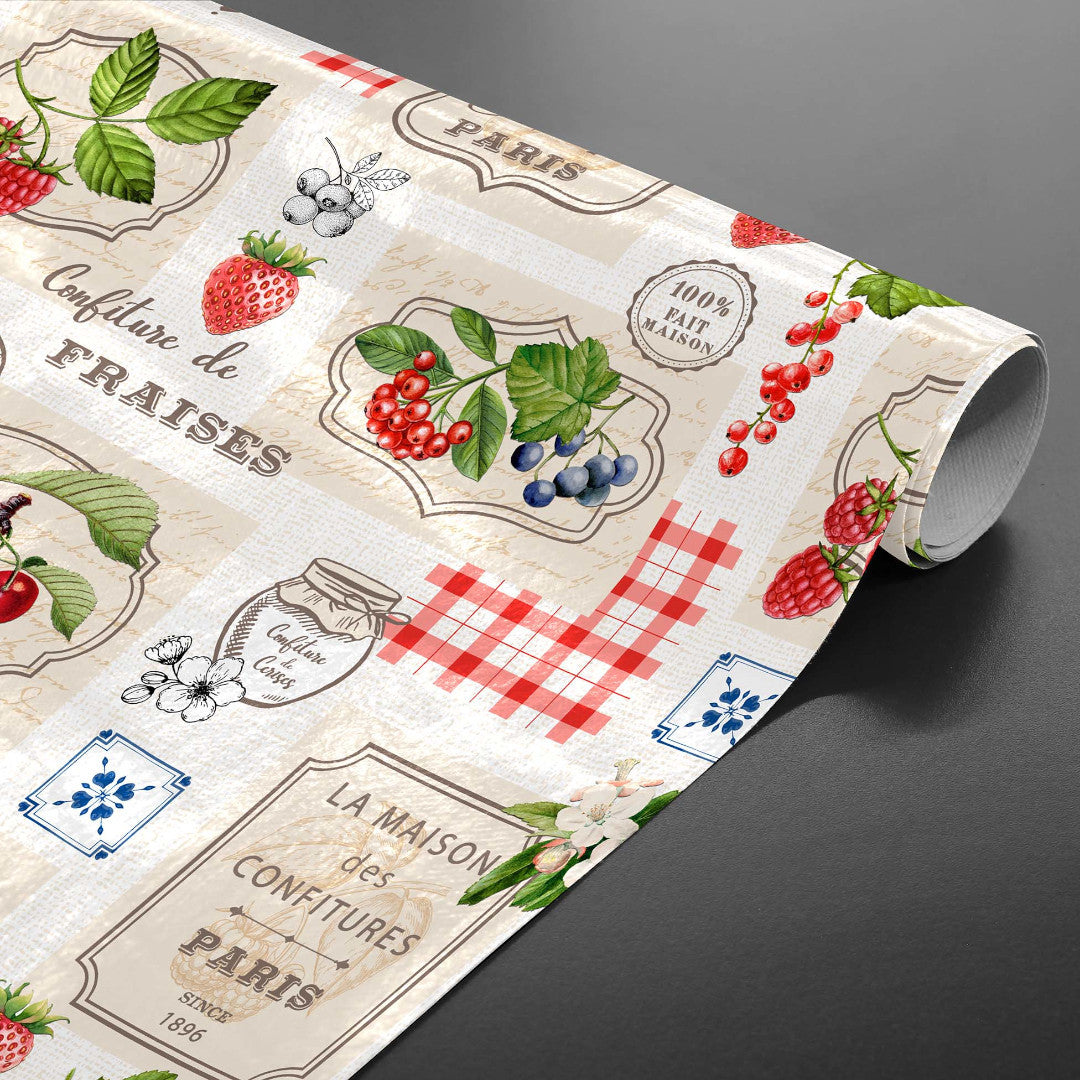 Voksduken GRIOTTE har et sjarmerende design inspirert av det franske landkjøkkenet. Mønsteret viser kirsebær, jordbær, rips og bringebær, kombinert med ruter, etiketter og dekorative detaljer i varme farger. Tekster som «Confiture de Fraises» og «La Maison des Confitures» gir et autentisk, nostalgisk preg som vekker minner om hjemmelaget syltetøy og hyggelige stunder på kjøkkenet.