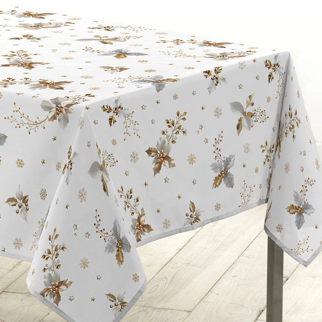 Den hvite bunnfargen gjør helhetsinntrykket lyst og innbydende, mens de gyldne detaljene tilfører en diskret varme til borddekkingen. Fargene og mønsteret er avstemte, slik at duken passer både til hverdags i desember og til julemiddager der bordet gjerne skal ha et klassisk preg.
