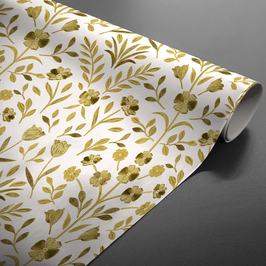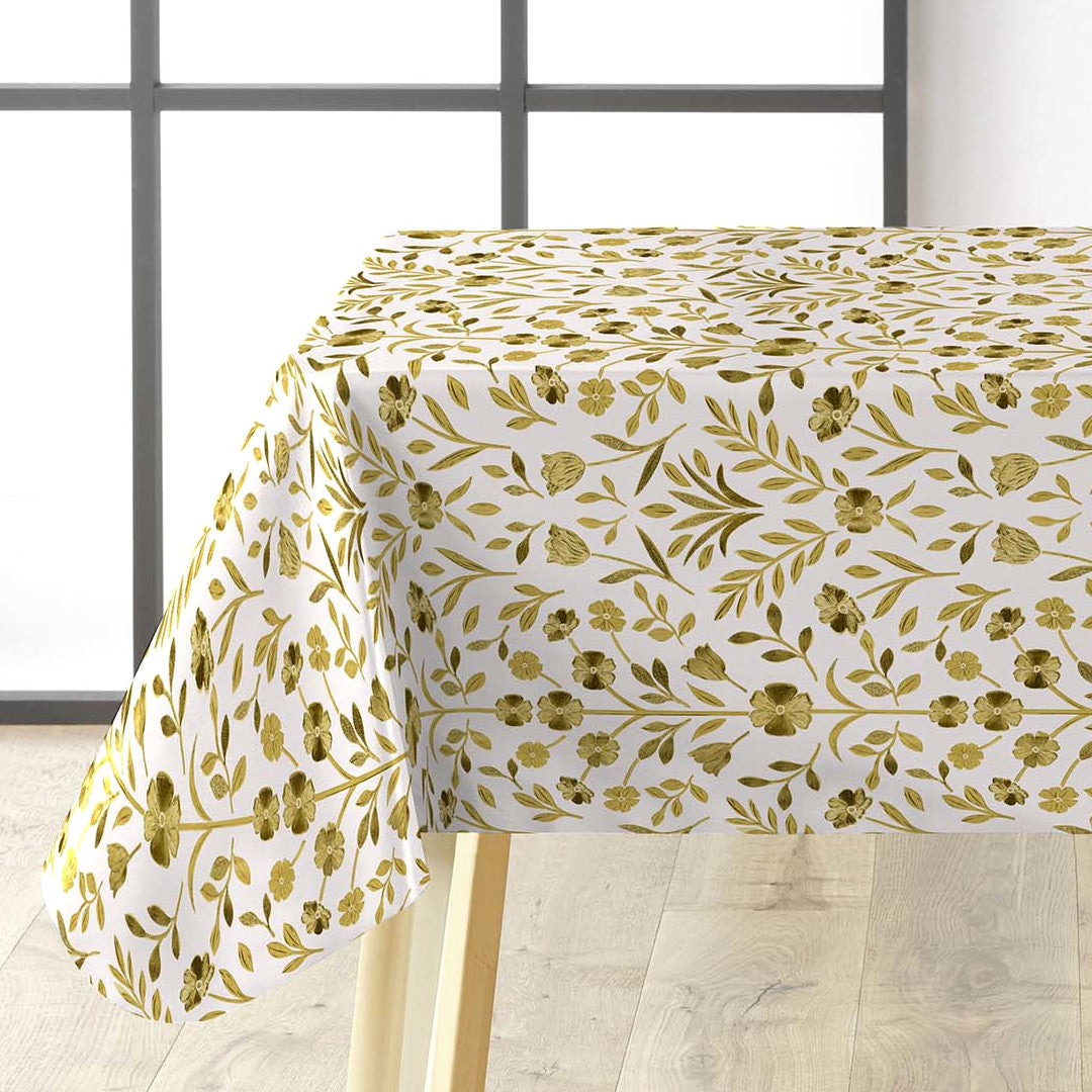 Guldflor Elegance – Voksduk med pregede gullblomster, hvit bunn