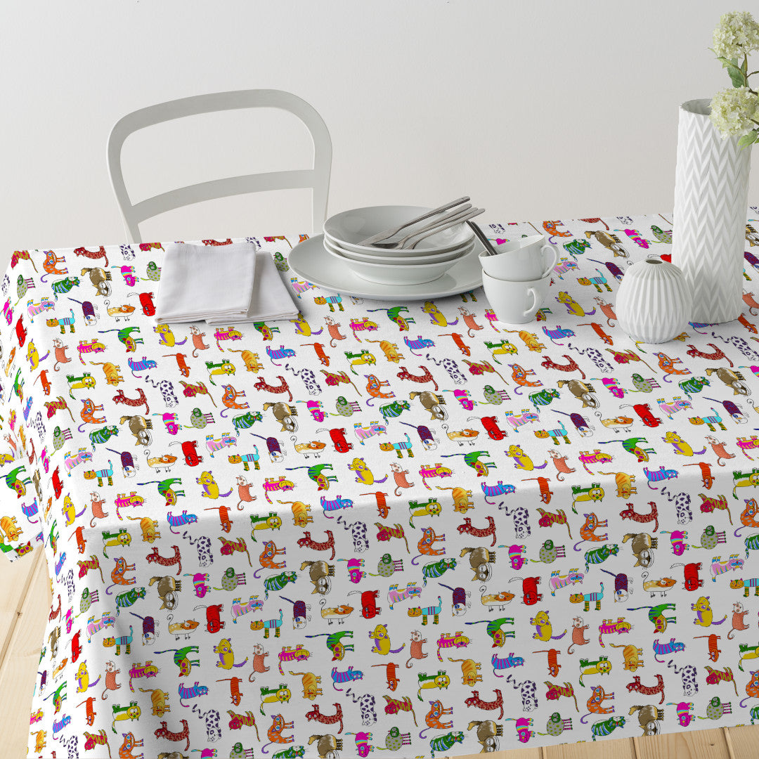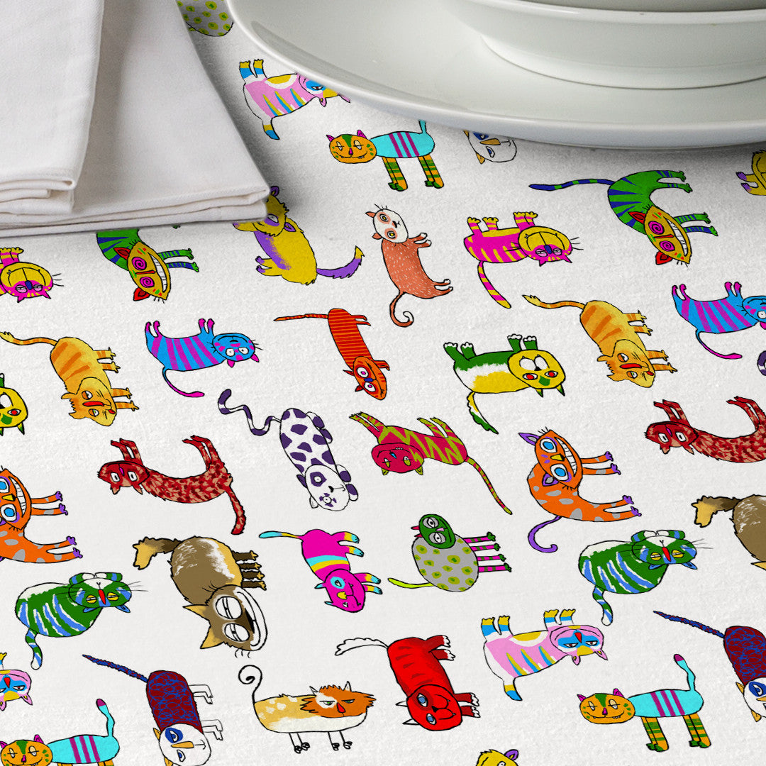 En livlig og glad duk fylt med morsomme, fargerike katter som får både barn og voksne til å smile. Mønsteret er håndtegnet og trykket på en lett offwhite bakgrunn som lar fargene tre tydelig frem uten å virke for sterke.