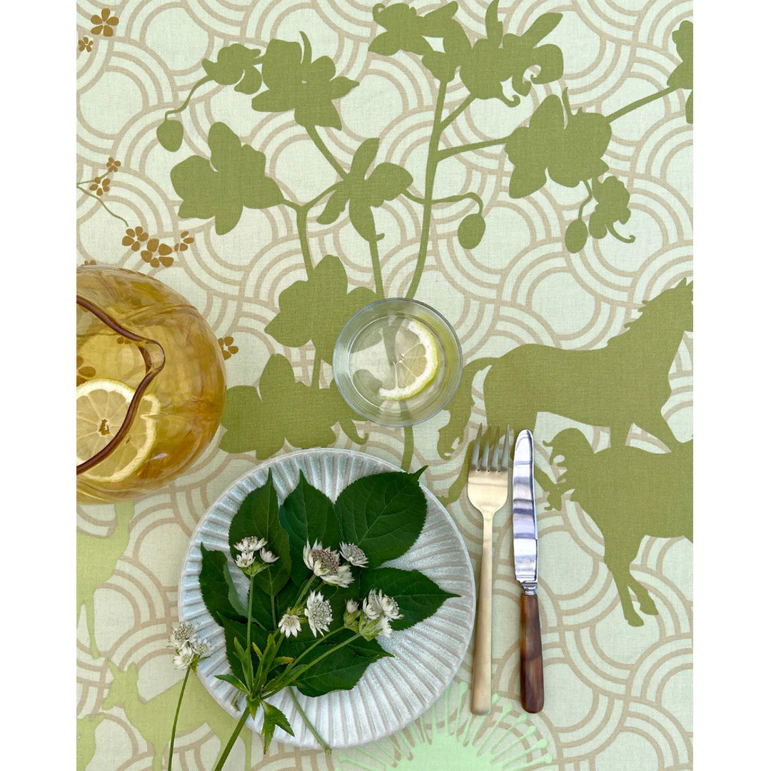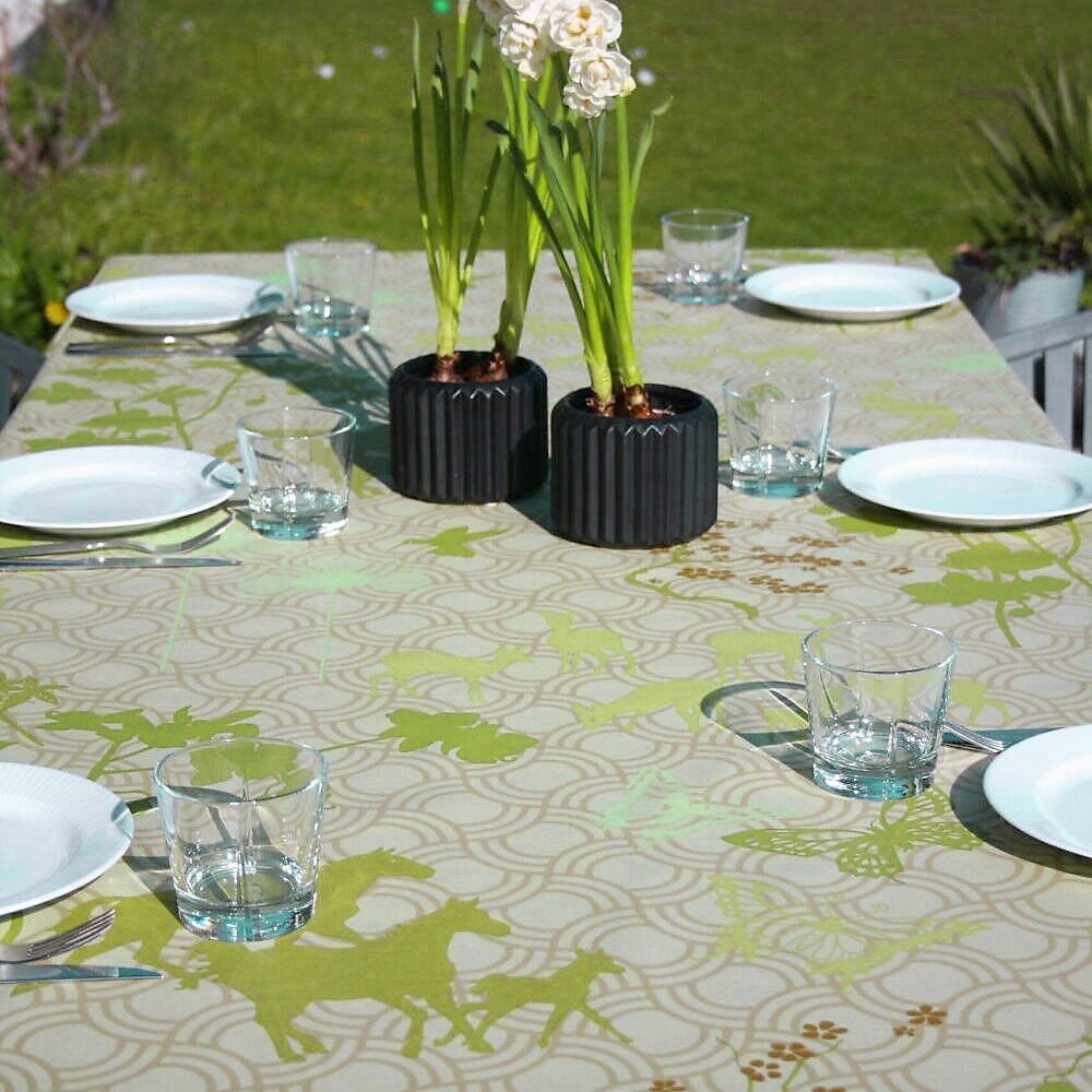 Bli med inn i eventyrskogen, hvor denne festlige duken i grønne nyanser med hester og sommerfugler inviterer til middag. Nyt naturen og livet!