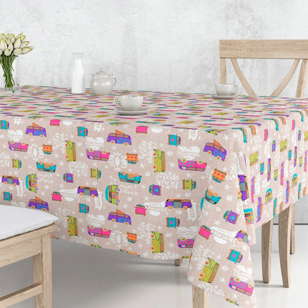 Hippie – Akrylduk med fargerike minibusser er i restordre og sendes så snart varen er på lager igjen.