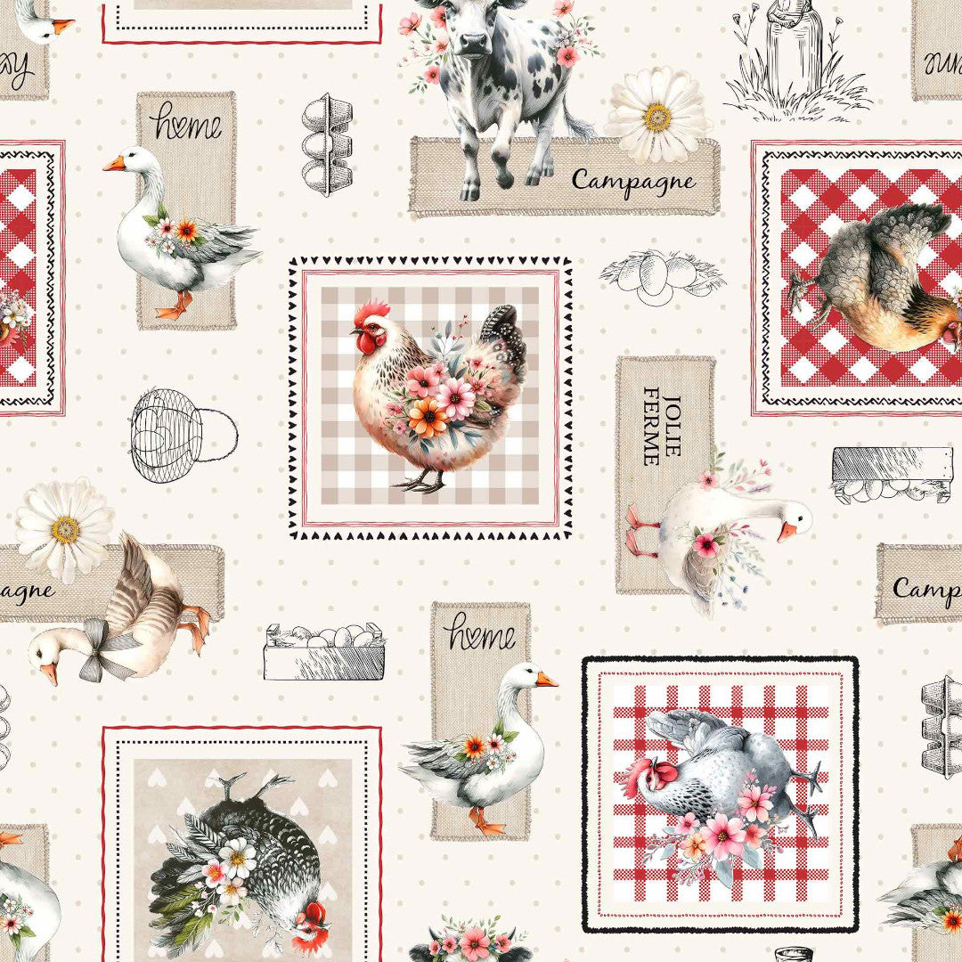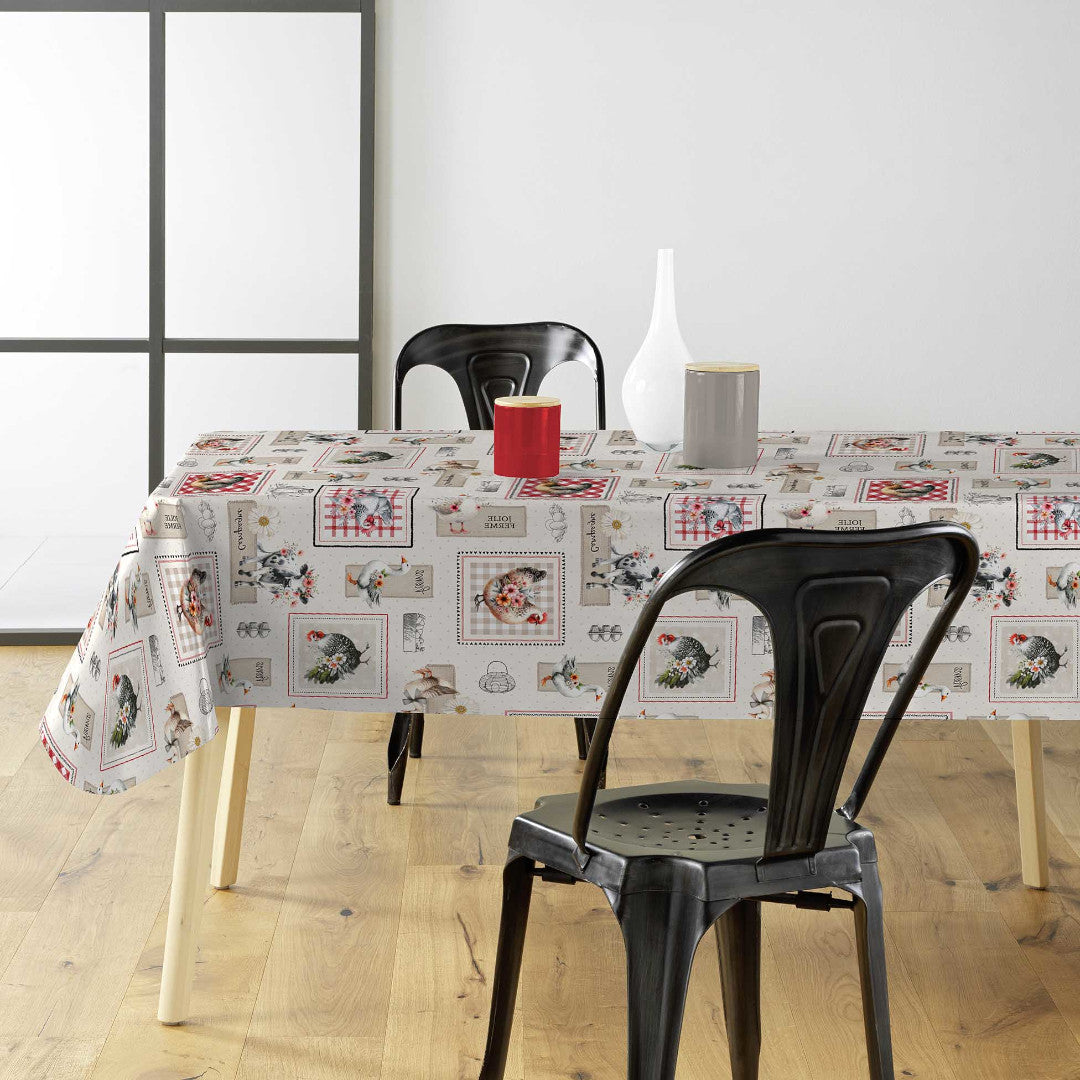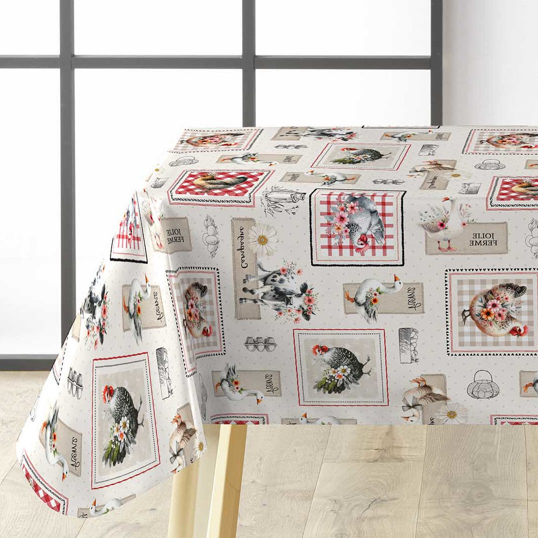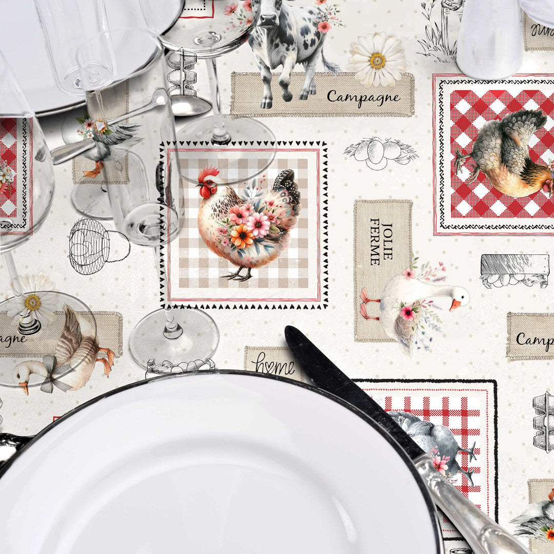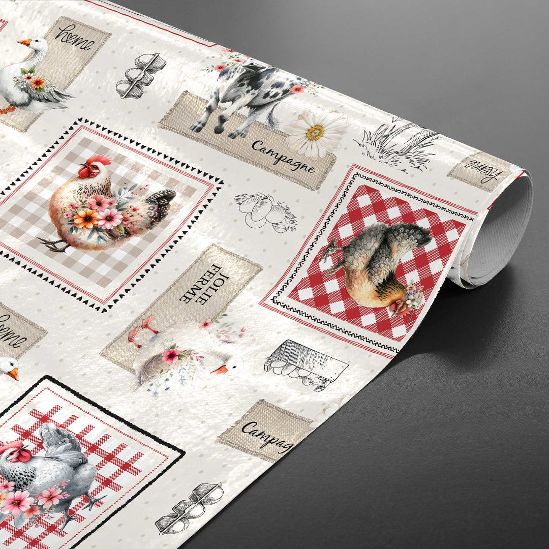 Motivene er vakkert illustrert i en blanding av håndtegnet stil og collageelementer med tekstilstruktur, og duken passer perfekt for deg som elsker det landlige kjøkkenet, sjarmen ved hønsehuset og et hint av fransk landsbyliv.