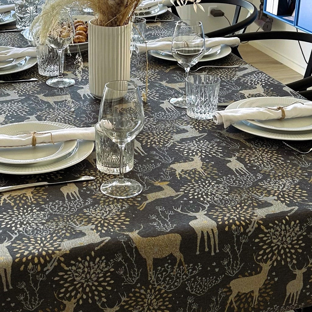 Juleduk Golden Reindeers – Akrylduk med reinsdyr i grått/gull er i restordre og sendes så snart varen er på lager igjen.
