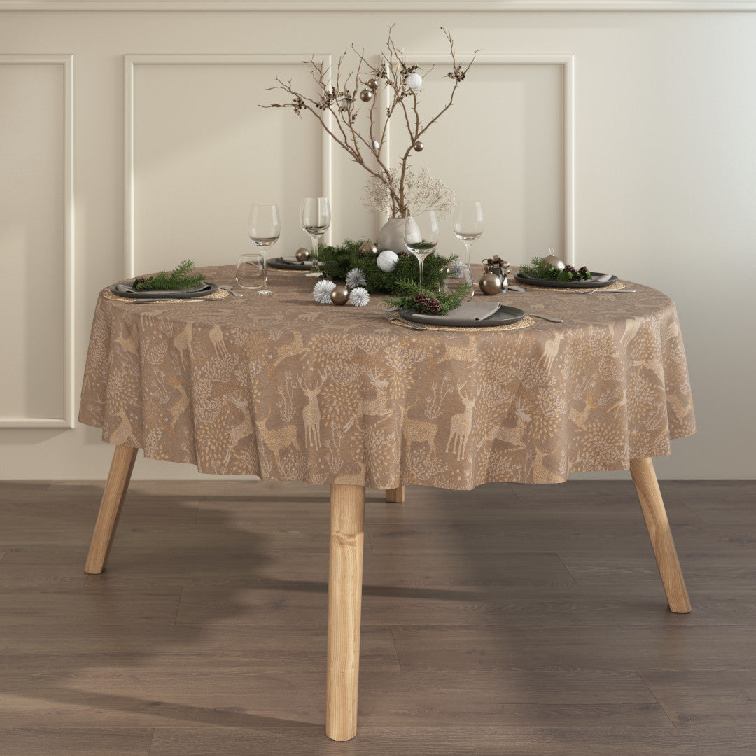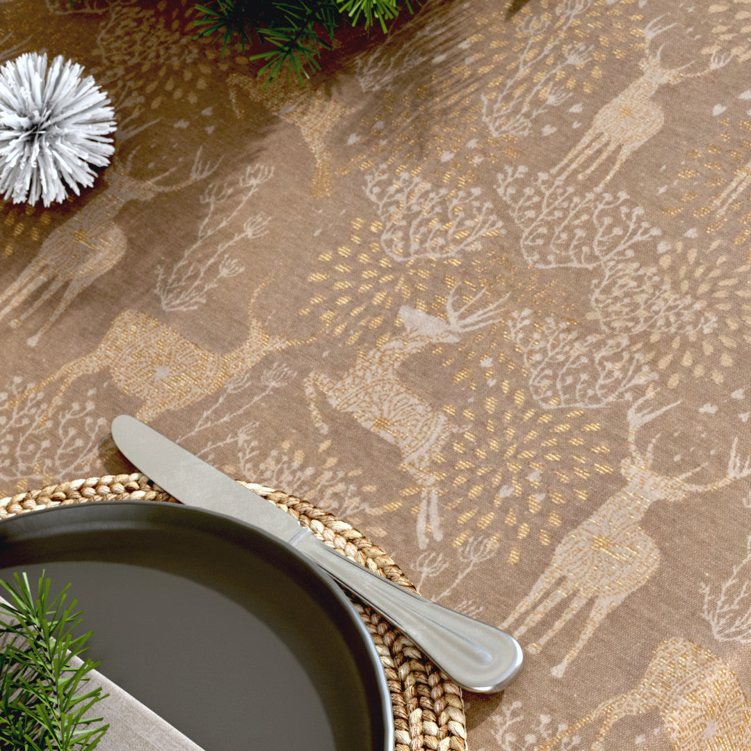 Juleduk Golden Reindeers Sand – Akrylduk i sand/gull med reinsdyr og antiskli