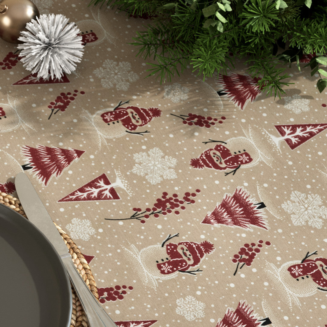 Skap den perfekte julestemningen med denne festlige juleduken i akryl. Med sjarmerende snømenn, røde juletrær, snøfnugg og glitterdetaljer bringer den både hygge og eleganse til julebordet.