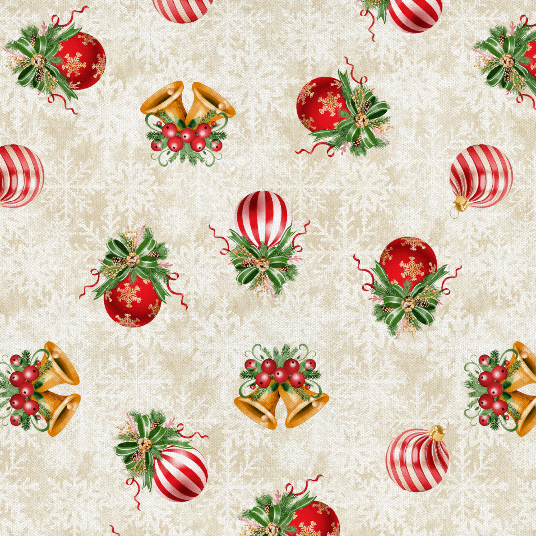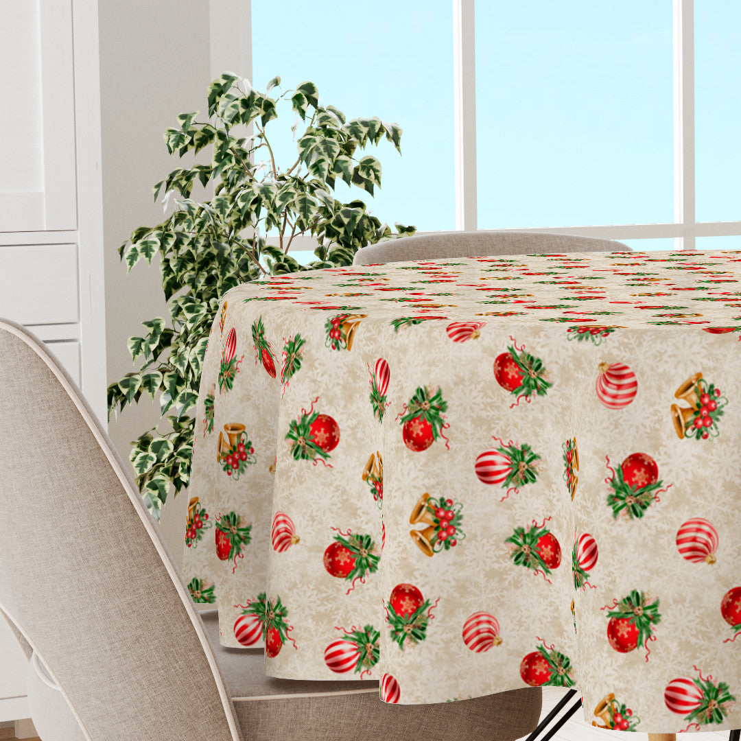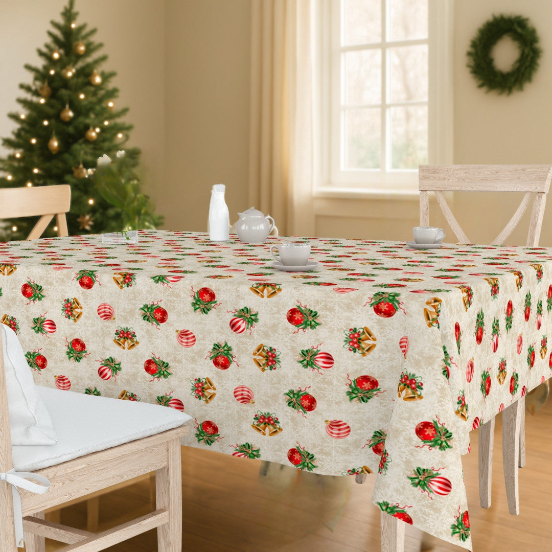 Juleklokke bringer klassisk julestemning til bordet med sine røde julekuler, gyldne klokker og grønne grangrener – alt satt mot en lys bakgrunn. De fine detaljene og gyldne tonene gir duken et elegant og festlig uttrykk som passer perfekt både til julemiddager og koselige adventsstunder.