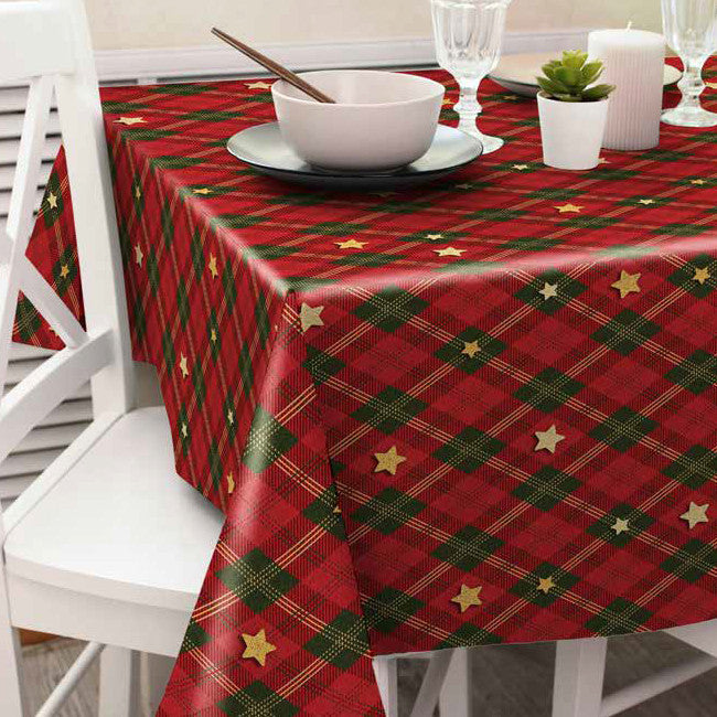 Juleruter Rød/Grønn – flott rutet julevoksduk med gullstjerner