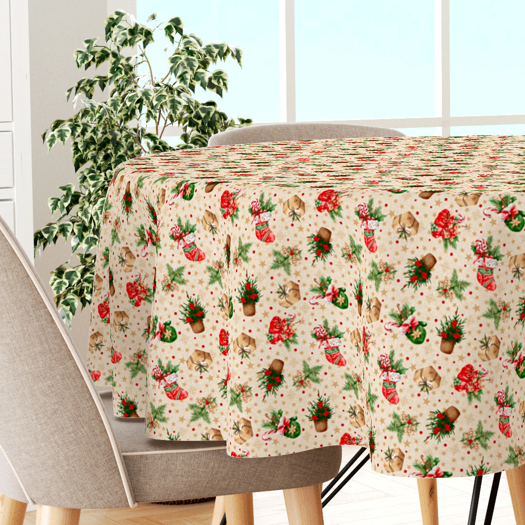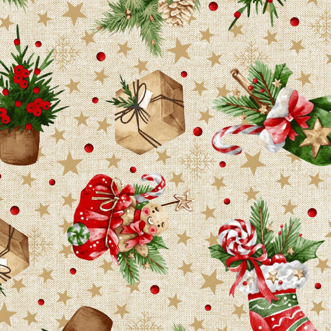 Julestrømpe & Gledelig Jul er duken som fanger alt vi forbinder med en klassisk jul. Her møtes julestrømper, gaver, kongler, gran og stjerner i et varmt og livlig mønster som skaper ekte desemberstemning rundt bordet.