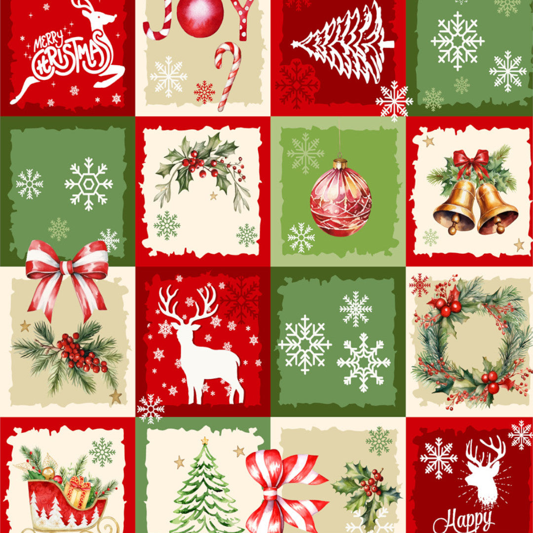 Denne festlige julevoksduken bringer en fargerik og koselig stemning til julebordet. Med sitt patchwork-lignende mønster fylt med klassiske julemotiver som snømenn, julekuler, sløyfer, gran og reinsdyr skaper den en varm og nostalgisk atmosfære. De røde, grønne og naturfargede feltene gir en flott og variert flate som pynter opp, enten det er til hverdags i desember eller den store julemiddagen.