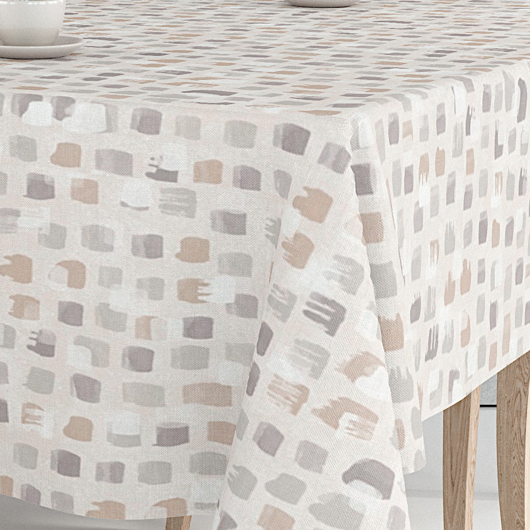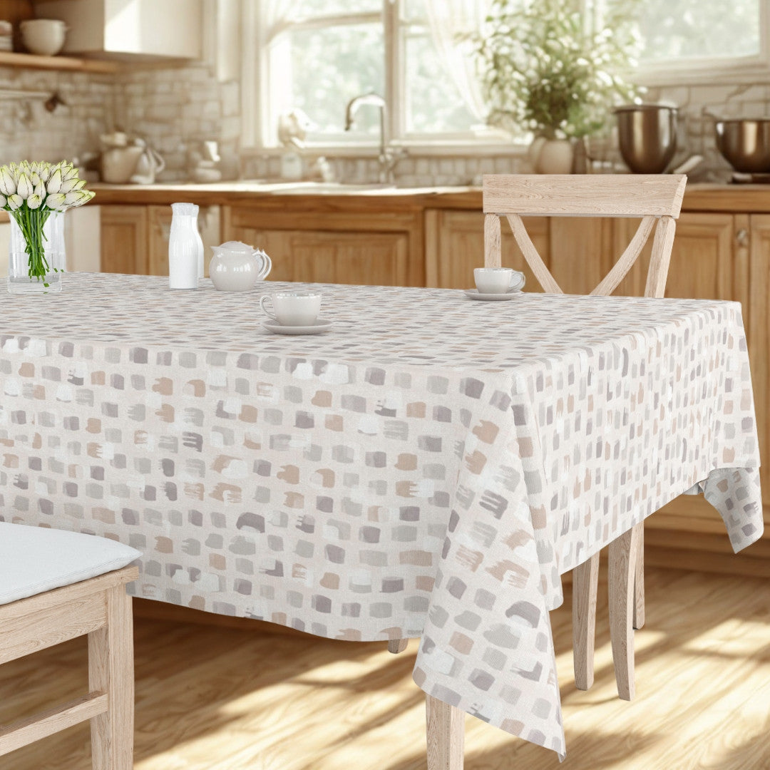 Leonor Beige er en ekstra bred voksduk på 180 cm med glatt overflate og et kunstnerisk mønster i varme naturfarger. De små, håndmalte penselstrøkene i beige, grå og brune nyanser gir et lett og avslappet uttrykk som passer både i skandinaviske og mer rustikke hjem.