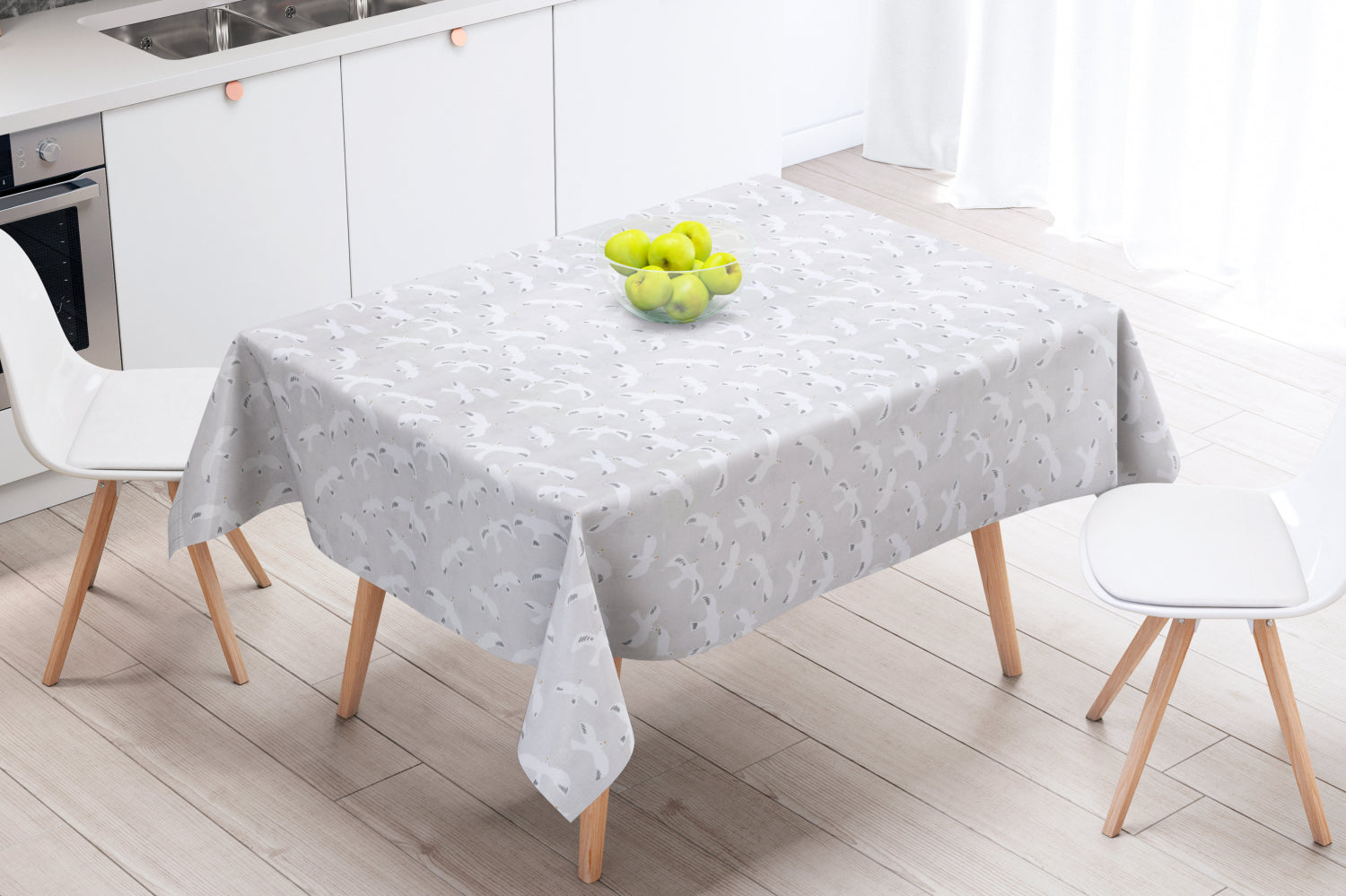 - Strykes på lav varme (maks. 110 °C) – med mindre duken har sklisikker bakside, som ikke må strykes