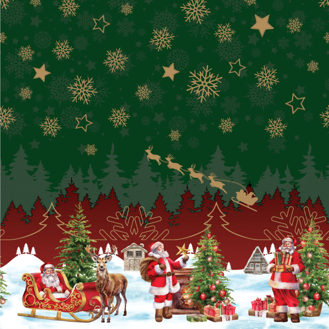 Nisseby julevoksduk i grønt oser av jul og tradisjon. Den dype grønne himmelen danner en vakker kontrast til det snødekte landskapet med julenissen, reinsdyr og pyntede juletrær. Gylne snøfnugg og stjerner pryder midten av duken og gir borddekkingen et varmt, klassisk uttrykk.