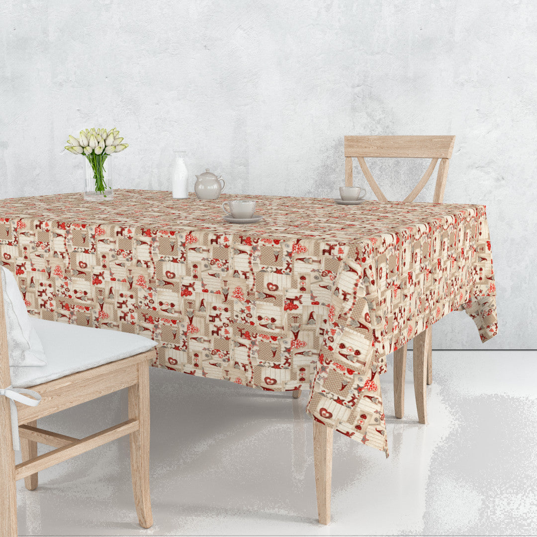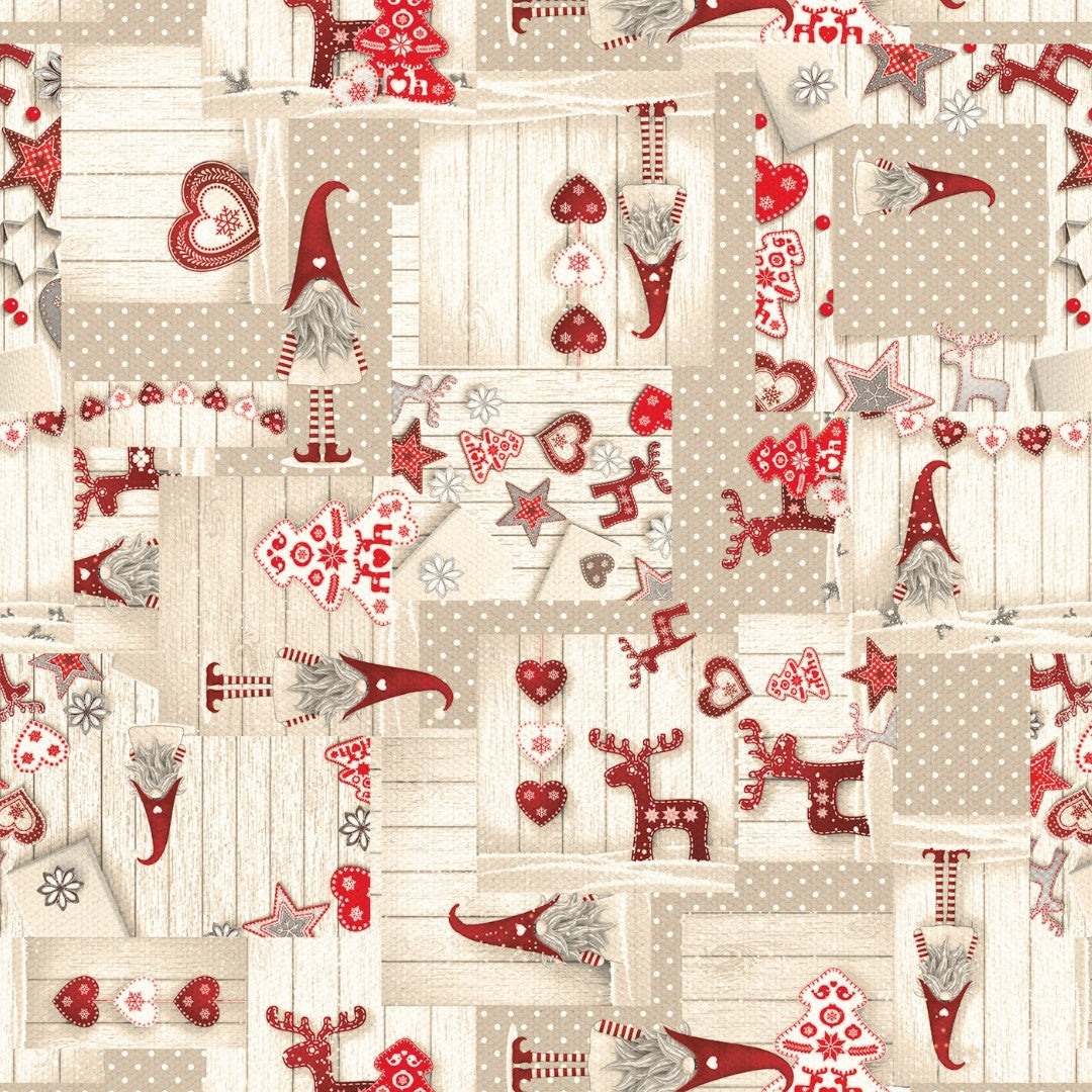 Nissehjerte forener det beste fra den nordiske julen – koselige nisser, fine hjerter, stjerner og små reinsdyr satt sammen i et varmt patchworkmønster. Fargene i rødt, hvitt og beige gir duken et rolig og rustikt uttrykk som passer perfekt både i landlige og moderne hjem.