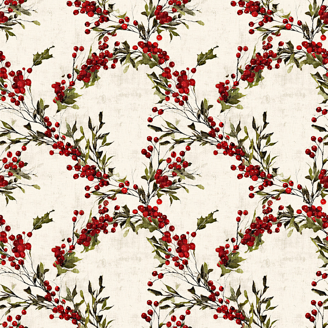 Nordfavn Bessie er en elegant juleakrylduk med et klassisk mønster av røde bær og grønne greiner på en lys, lett melert naturfarget bunn. Mønsteret har et lett, håndmalt preg som gir duken en varm og levende karakter uten å virke tung. Den oser av nordisk jul – enkel, tradisjonell og vakker.