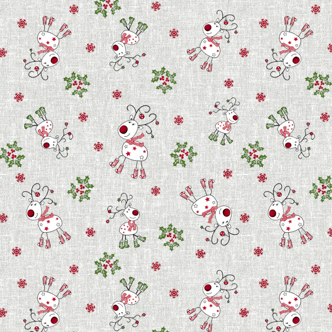Nordfavn Ciervos Navidad er en sjarmerende julevoksduk med et lyst og vennlig uttrykk. Den fine grå bunnen har et vevd preg, og mønsteret består av søte reinsdyr i rødt, hvitt og grønt, omkranset av kristtorn og snøfnugg. Helhetsinntrykket er lett og lekent – en juleduk som skaper god stemning uten å bli overdådig.