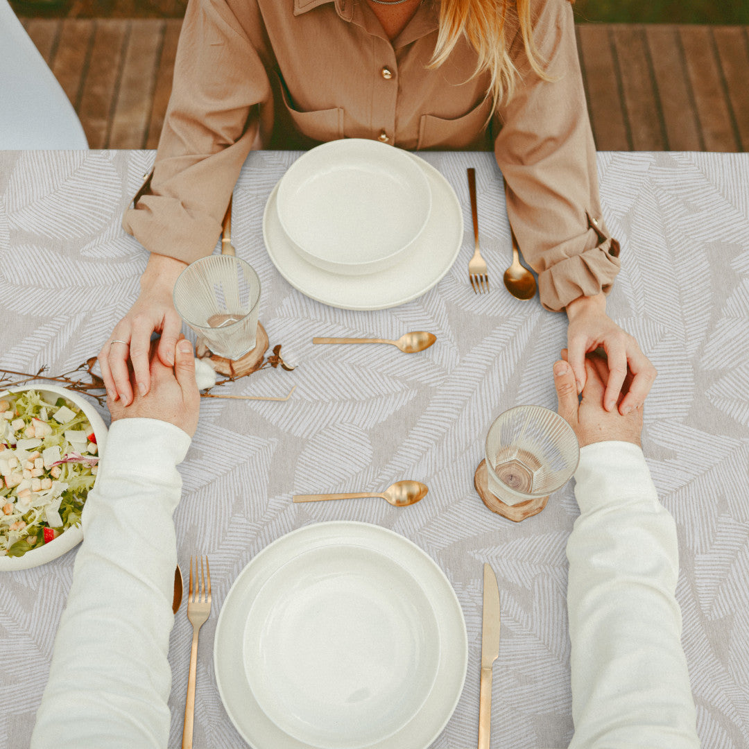 Med sitt sarte bladmønster og varme sandfargede bunn er Nordfavn Edna en akrylduk som utstråler ro og diskret eleganse. Det nesten håndtegnede uttrykket i de hvite bladene gir et lett og luftig preg, og de naturlige nyansene gjør duken enkel å kombinere med både lyse og mørke detaljer på bordet.