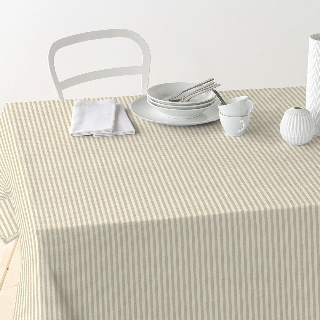 Denne akrylduken i serien Nordfavn Ibiza har tverrgående striper i en lys, sandfarget tone på en naturnært bunn, noe som gir et klassisk og rolig uttrykk. Stoffet har et visuelt linpreg og er vevd i 100 % bomull med akrylbelegg, som gjør duken praktisk og enkel å tørke av.