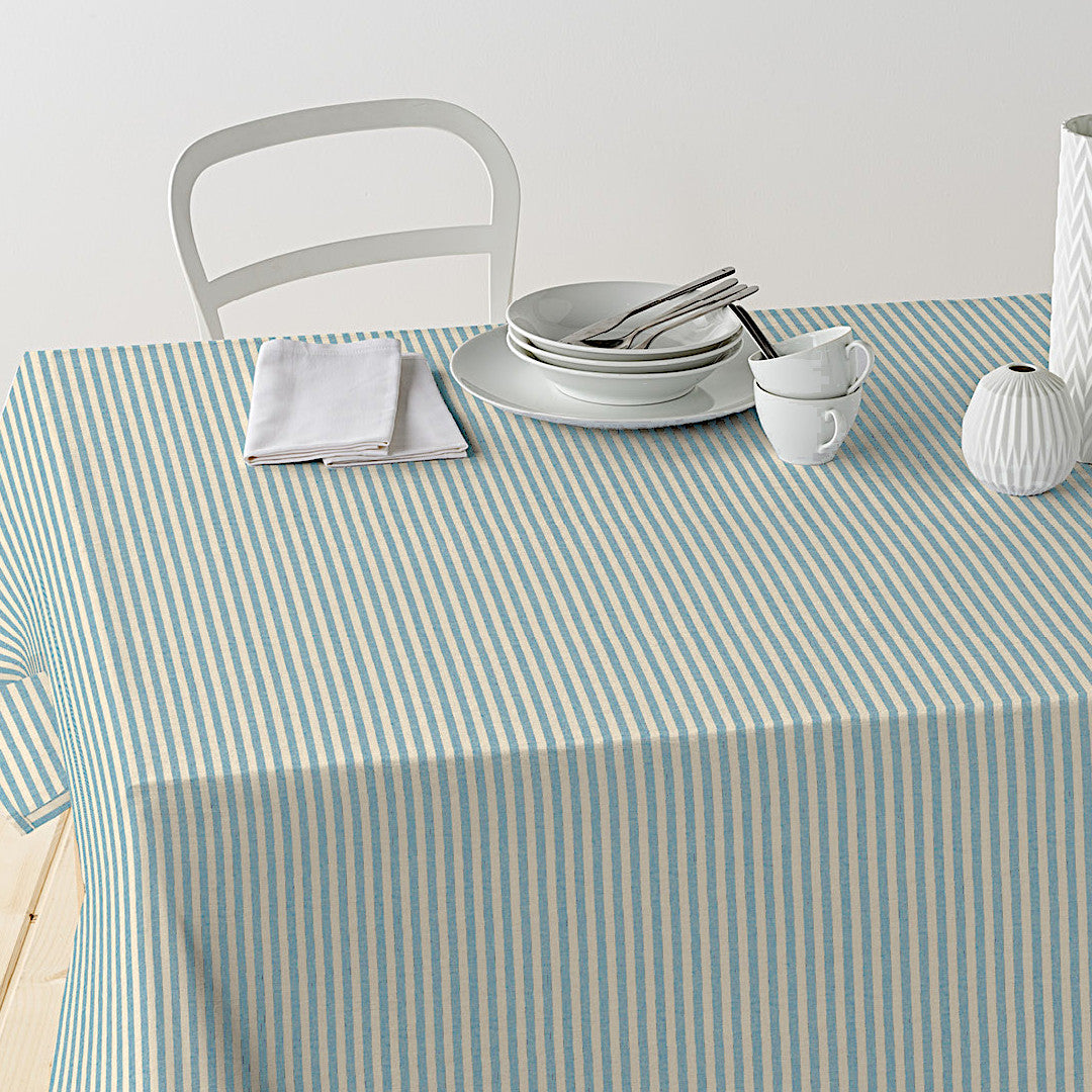 De støvede blå stripene løper på tvers av duken og skaper et rolig, grafisk uttrykk på den naturfargede bunnen – perfekt til både frokostbordet og avslappede middager. Ibiza passer utmerket inn i en nordisk stil og er samtidig lett å vedlikeholde med sin praktiske, smussavvisende overflate.