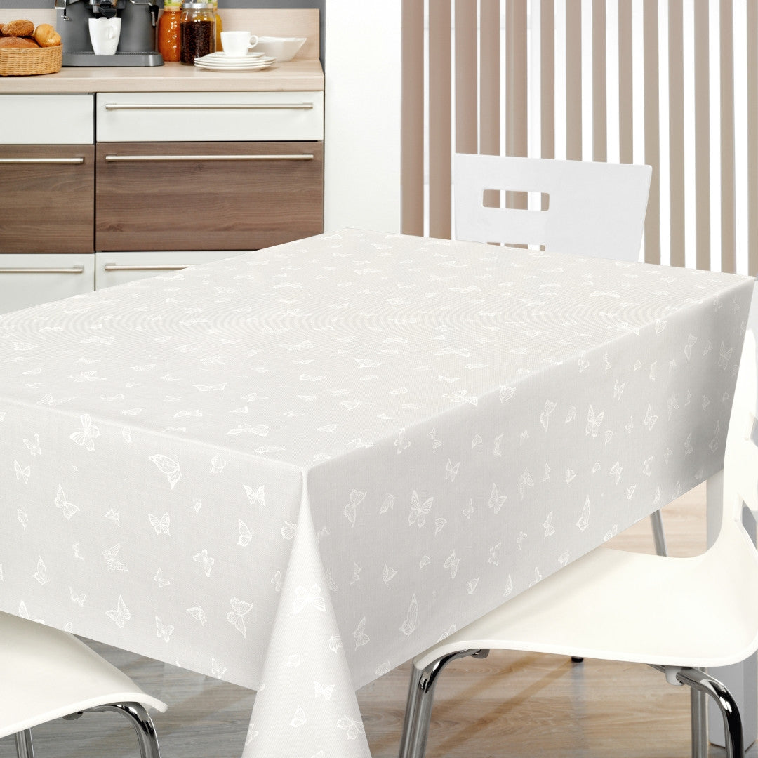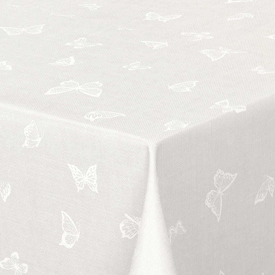 De hvite sommerfuglene svever lett over den lyse bakgrunnen og skaper en luftig stemning som passer like godt til hverdagsbordet som til festlige anledninger. Duken har en glatt overflate uten tekstilstruktur, noe som gjør den spesielt enkel å rengjøre og vedlikeholde – ideell til bruk i hjemmet, så vel som i kafé, restaurant og institusjonsmiljøer der man ønsker både slitestyrke og et stilrent uttrykk.