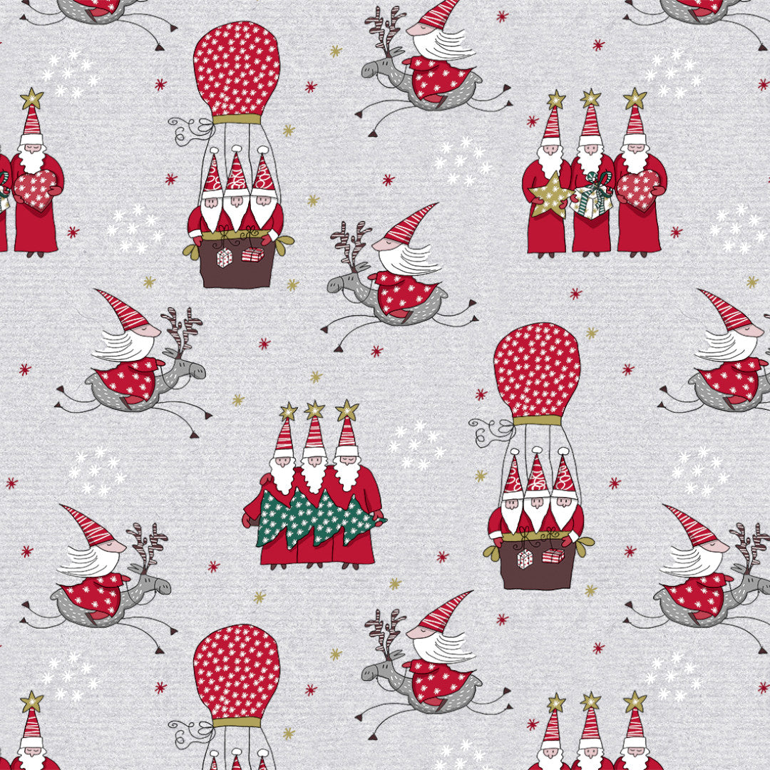 Nordfavn Wichtel er en julevoksduk med et poetisk og annerledes uttrykk. På den lysegrå bunnen vises et mønster med fine vinterfigurer, luftballonger og reinsdyr i bevegelse – og midt i motivet står tre karakterer som minner om De tre vise menn, tolket i et moderne, nordisk formspråk. Fargene i rødt, grått og gyldne toner skaper en varm balanse mot den rolige bakgrunnen, og detaljene gir duken et særegent kunstnerisk preg.