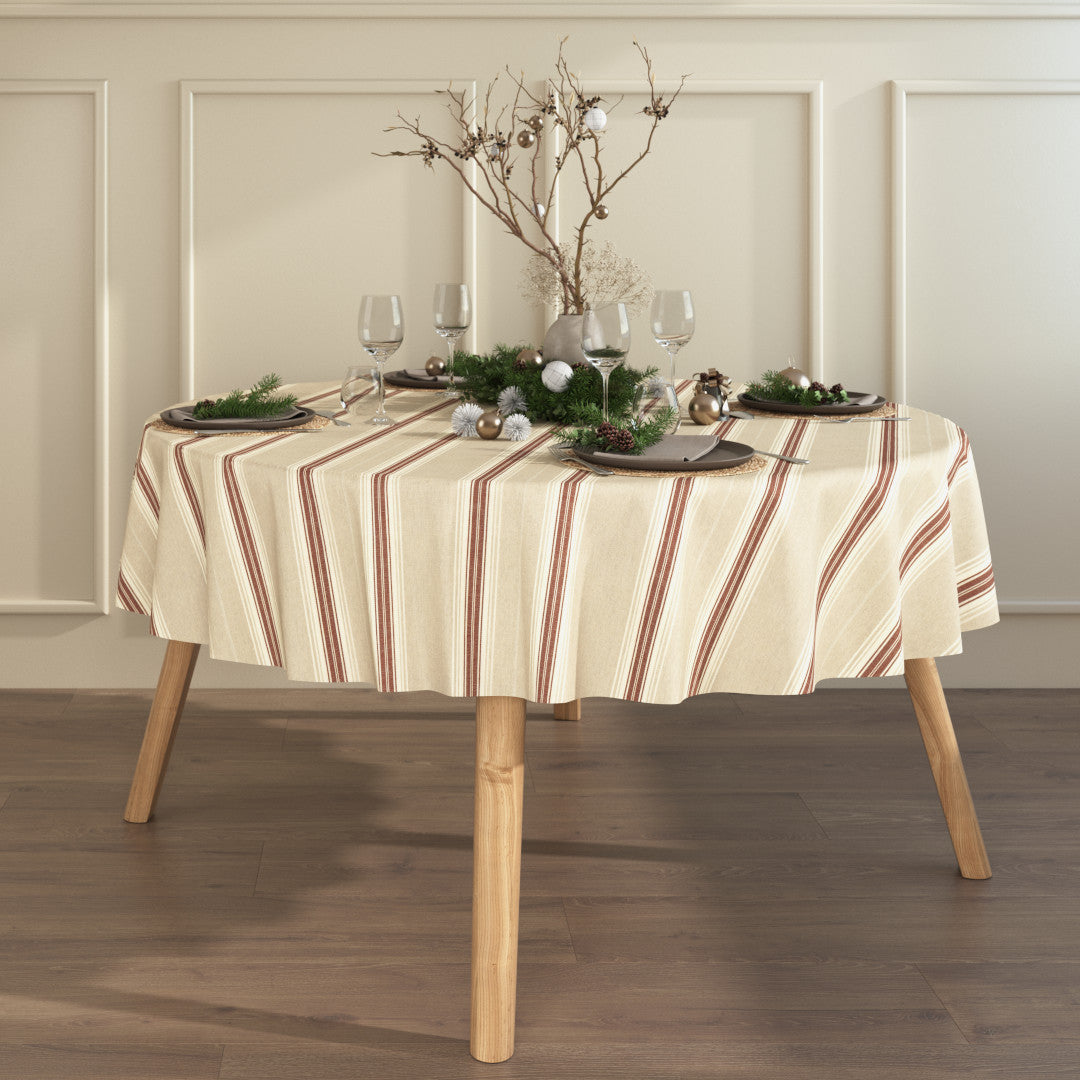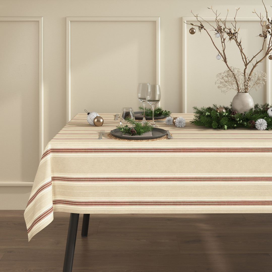 Dekk et varmt og innbydende julebord med Nordisk Julestripe Rød – en vakker juleduk i hørlook med klassiske nordiske striper. De røde og naturinspirerte fargetonene skaper en koselig og tradisjonell stemning som passer perfekt til julens mange anledninger.