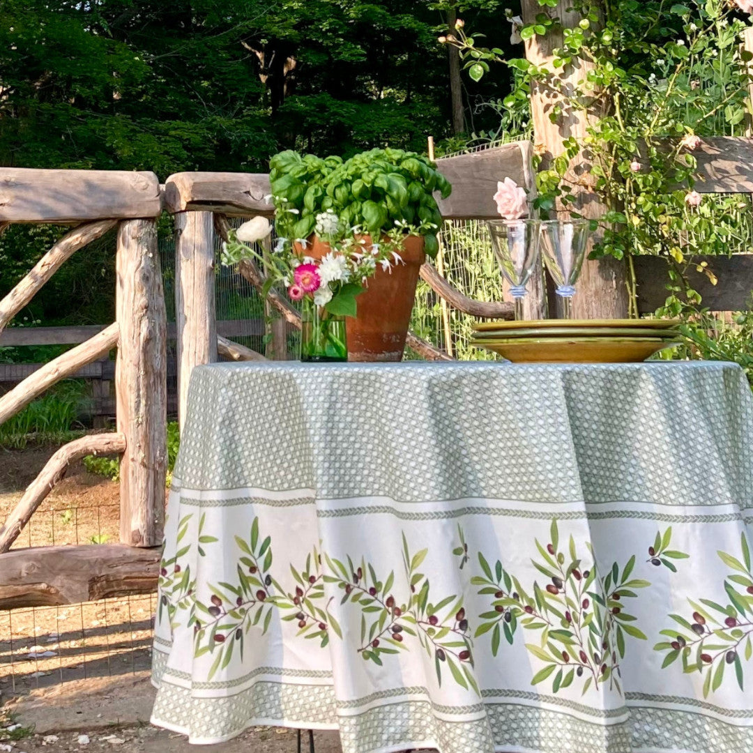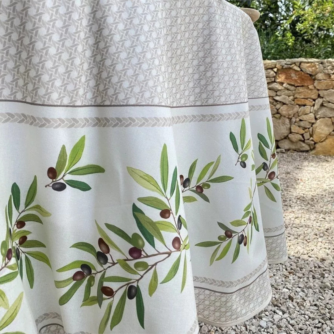 En vakker og harmonisk rund duk med olivengrener i grønne og brune nyanser som slynger seg elegant over en myk, lys beige bakgrunn.